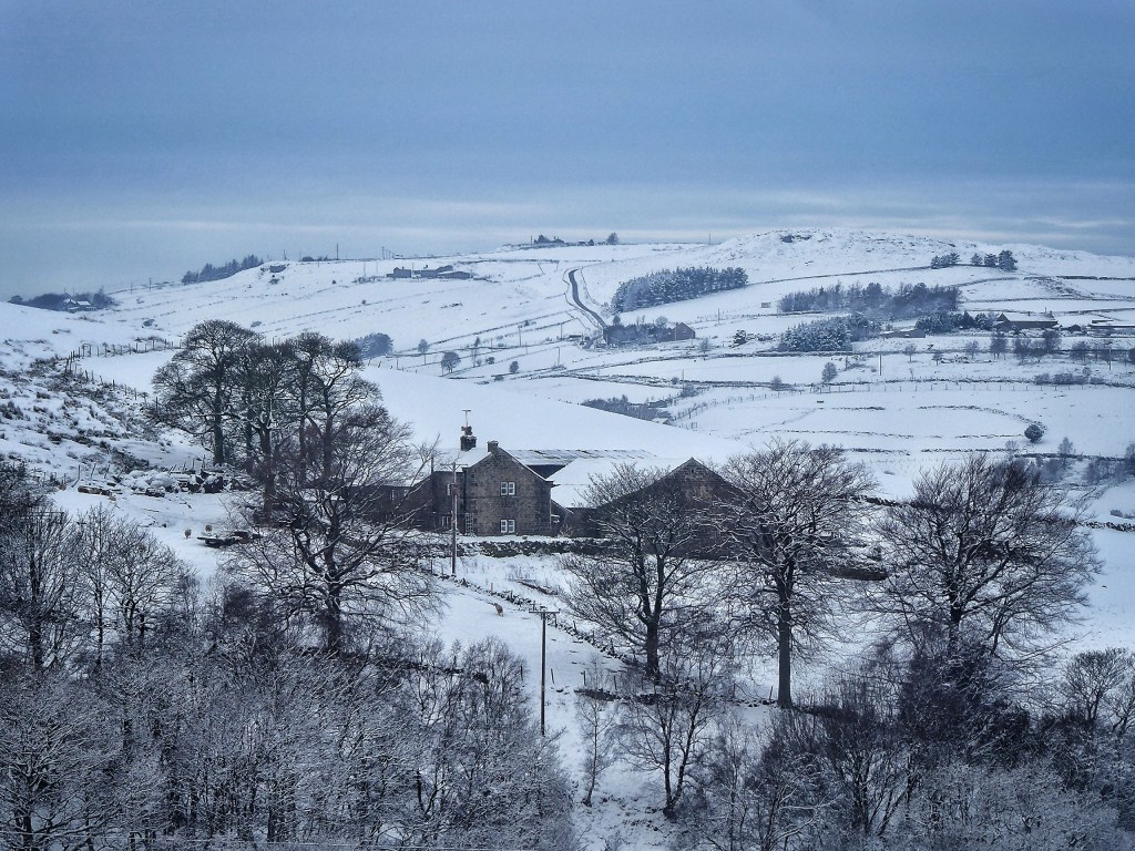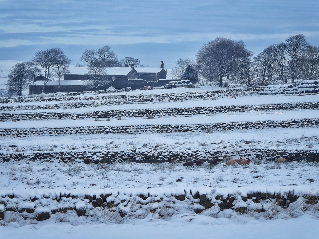 Erringden | The school run through the woods is under branches bowed low with snow, which my son takes great delight in pulling down to unburden them of their load, then letting them go to spring back up to their normal angle. After drop off, at the meeting of the Colden and the Calder, a heron spears and swallows an improbably large fish, spending the next several minutes grotesquely contorting its neck – twisting and wringing, arching and stretching – to subdue the writhing meal and expedite it to its stomach. A melt is on the way, with the atmosphere due to put on nine degrees overnight, but for now the stacked roofs of Hebden Bridge are white and its woods petrified in an ashen rime. High in the parish of Erringden, blue tits and goldfinches are queuing while the birdfeeders are being refilled at Pinnacle Farm. The walls surrounding Armytage Rhodes’s 19th century model farm of Erringden Grange sport a chequerboard pattern, with a bonnet of snow perched atop the small exposed ledges of the outward facing stones contrasting with their black vertical faces. Lower Rough Head’s sheep have congregated around the bale-stuffed feeder, leaving the rest of the sweep of their pasture undisturbed, which, under the flat light of a slate sky, is a blankness that the eye cannot gain a purchase on. At Edge End, a single bellow from the barn confirms the herd is now harboured, and the absence of tracks leading to it suggests that the decision was made before the snow arrived. The only tracks are those of the quad bike and its cargo of hay on their way to see the sheep are sustained through this early snap; perhaps after the melt they can continue cropping the last of the grass, but these tracks mark the start of the winter-long labour of delivering the preserved bounty of summer to the stock.