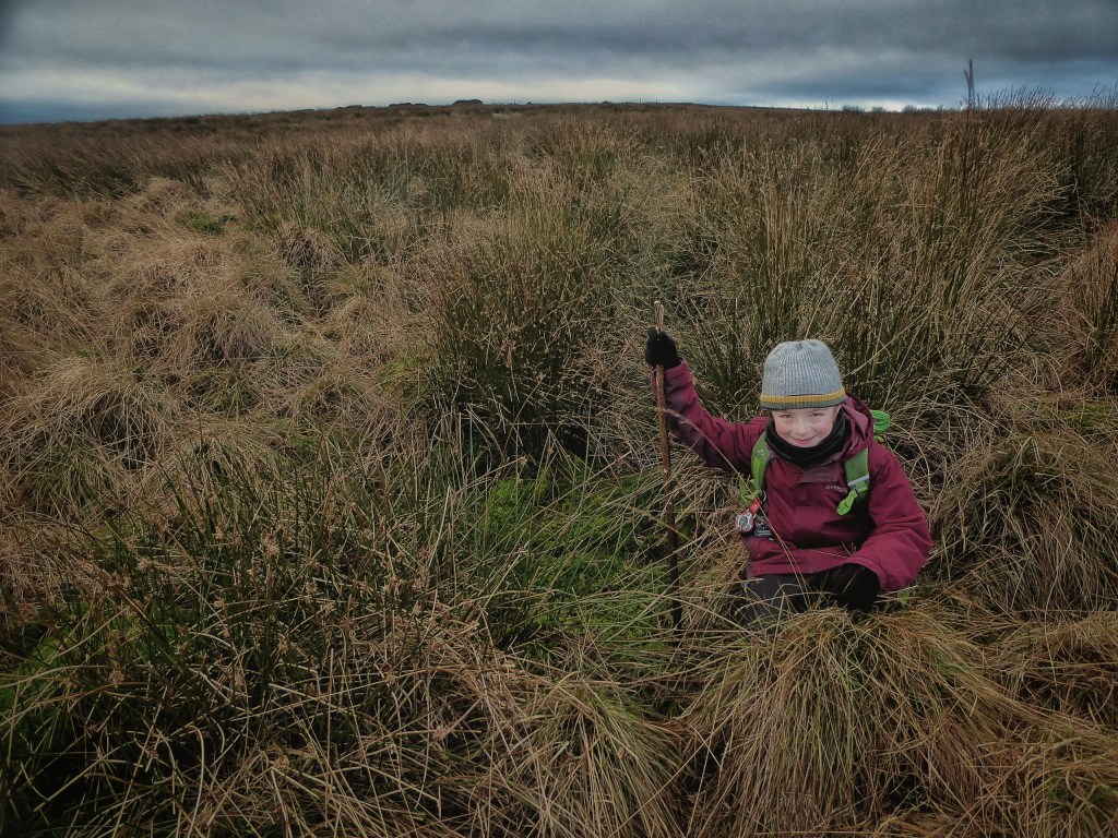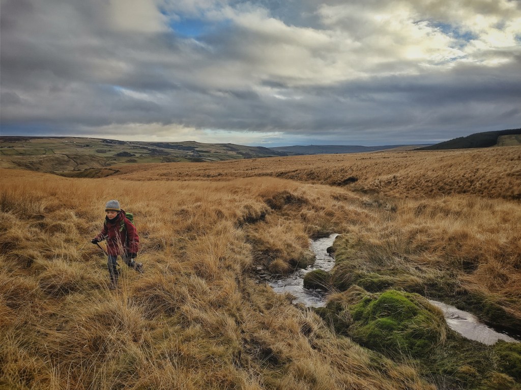 Source | We live a little above the River Calder and are separated from it by the railway, but are close enough that at night in the absence of traffic we can hear its rush and the one-note calls of dippers in flight, charting its channel. In honour of a little bedtime story I told my son many times when he was young, about two mice who adventurously followed the river they lived beside up to its source, we have been doing the same. The three miles to Todmorden was largely completed on the towpath of the Rochdale Canal, with peeks taken at the river where it rubs alongside the canal. The next three and a half miles, through Cornholme and Portsmouth, was an exercise of keeping track of its course, as it is frequently culverted under mills, gardens, terraces and from one side of the road to the other. And now, from where the bus drops us today, at the foot of its cascade down the cleft of Ratten Clough, we can complete our journey to its source high on Heald Moor. Across trackless moor with 650 feet of ascent, we cover the roughest mile-and-a-half we have yet encountered on any of our walks. What accounts for the punishing terrain is Molinia grass, which grows in ankle-twisting mounds that it hides under its own growth such that one never knows whether the next step is going to be a teeter atop a two-foot-tall tussock or a plunge into a water-filled hole which skulk in hungry wait between these masses. It is a kind of masochism to voluntarily walk through this jungle, and I keep a close eye on my son, for whom, being shorter, the menace of Molinia is all the greater, but his hardiness never ceases to amaze me and he takes this whole endeavour in his rapidly growing stride. We stop for a snack beside a shattered wall which must have once marked the top of an attempt to ‘improve’ the moor, but the Molinia, an invasive species which chokes out all other species and is a problem with which conservationists, farmers and moorland managers are increasingly having to grapple, has long since erased any progress that was once made. While chemical treatments are often used where the problem is acute, the chronic cause of the problem is undergrazing, so it is good to pass a small herd of Highland cattle – which we watch being visited by two farmers on a quad bike – doing battle. On the other side of the valley, the encouraging hoots and hollers of herdsmen draw our attention to a pageant of 60 cattle being gathered towards pens. These sights of the people who work this landscape are always a good reminder that, however intrepid we think we are being, we are transient, and fair weather, visitors. We push on, following the infant Calder as it dwindles until, probing with his hazel staff among standing water in a rushy bog, we can no longer detect its flow by sound of gurgle or sight of ripple. We declare our quest over, just as the river’s journey to join the Aire at Castleford, 34 crow-flying but 53 river-meandering miles distant, is just beginning. He wants to take a souvenir from this auspicious place, so we empty a pot of grapes and he scoops up some water and adds a short stem of rush and a sprig of sphagnum. On the way up to the crest of the moor I allow him to add a horned sheep’s skull to these mementos. We find enough snow, which down in the valley disappeared five days ago, for a snowball fight, and with his first throw he scores a direct hit down my neck. At the trig point on Thieveley Pike, for as long as we can tolerate the stinging wind, we take in the views of hazed sunbeams glinting on Rochdale’s roofs, the snow-scarped bulk of Boulsworth Hill and the shining, domed whaleback of Penyghent.