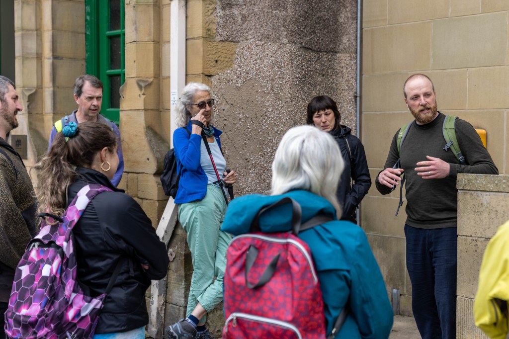 There is time for those who wish to take the prescribed route to view Joseph Greenwood’s grave, pushing through holly to look down over the retaining wall at the back of the cemetery at his and his wife’s prostrate gravestone, only rediscovered in the past few years and turned over so it can be read. When it is time to leave, there is plenty of reluctance, and the group becomes strung out among the graves, but I am mindful that some are banking on getting back to the Town Hall at the advertised time. So we close the groaning gate behind us and weave down through the terraces that mounted ever higher up the hillside through the 1800s. The talk is of delight in seeing new places; of the choices some farmers have made to abandon the post-war model of intensification and pursue a regenerative approach, or even rewilding; of the changing economy of the town we are now re-entering, its loss of ‘useful’ shops and its serving of the visitor above the residents, just as the surrounding landscape is no longer principally serving a local economy but may increasingly be enlisted to serve society at large in a national effort to avoid dangerous global heating.