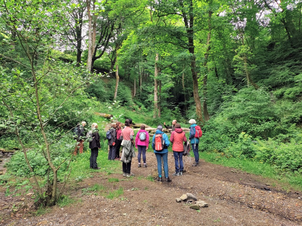 To get a feel for what it is to read a landscape, instead of giving the group a potted history of this place, I invite them to look around and to share what they can see of the story of this place, both of its past and how it developed and was used, and about its present too, how it is used now. Eyes scan around and tentative suggestions are made: there doesn’t seem to be much water coming down the clough, so has it been diverted higher up?; the beech trees seem to be planted very close together; an attractive semi-circular wall draws attention, and whether it was intended to be functional or ornamental is mused over; and this unnaturally flat bottom to the valley on which we stand clearly signifies some major alteration to the topography, but to what end? The clues left behind are tantalising, but as so often, inconclusive.