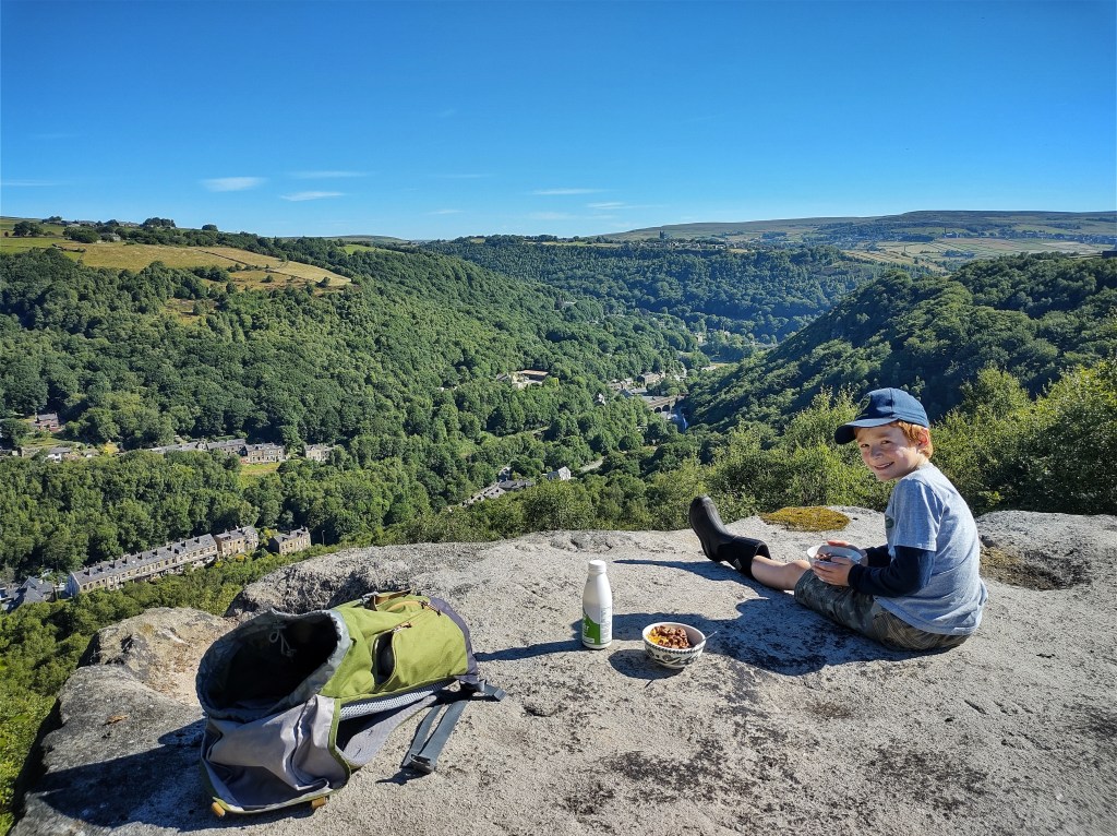 Breakfast | ‘When can we go up Foster’s Stone again?’, my son asks on a Friday evening. He’s right; it’s been a while. The overhanging outcrop is a significant landmark in our view, although it’s being gradually obscured by a neighbouring beech tree, a remnant of a plantation that was clear-felled during the Second World War. So the following morning we make our way up through the self-seeded, maturing woodland of birch, sycamore, oak, rowan, holly and ash that has spent the past 75 years or so re-colonising the slope which on the 1851 OS map is labelled as Edge End Moor. Just as we did in 2020 at the beginning of his school summer holiday, we take chocolatey cereal, bowls and milk with us for a fine breakfast with a view.