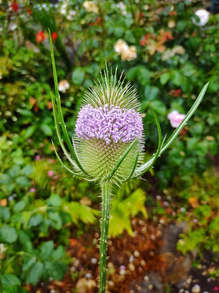 Teasel | Years ago now, a teasel arrived in our front garden, unlooked for but most welcome. Now, every year without us doing a thing, our front path is lined by a head-high avenue of them. The bees love their candyfloss-coloured flowers, which bloom first in a band around the centre of the egg-shaped flower head before separating, half the band ‘travelling’ up and half down. Some visitors, it is true, are snagged on their spiny leaves on their way to the door, but we like to think the guard of honour they provide makes up for these indiscretions. And we would not wish to deprive our son of the pleasure of bending down the leaves after rain to create a spillway for the pools of water that collect in the cups formed by their opposite meetings at the stem. These little moats are not only a defence against insects that land on the leaves advancing further up the stem, but also are a source of liquid sustenance, since plenty of insects do in fact drown in them and their nutrition is absorbed through the plant’s tissues.