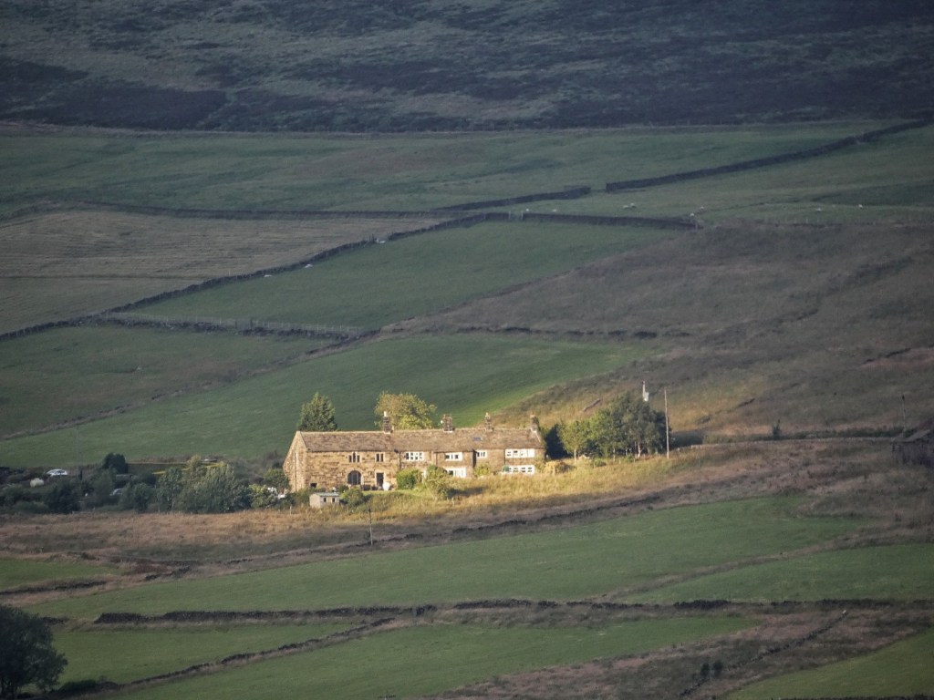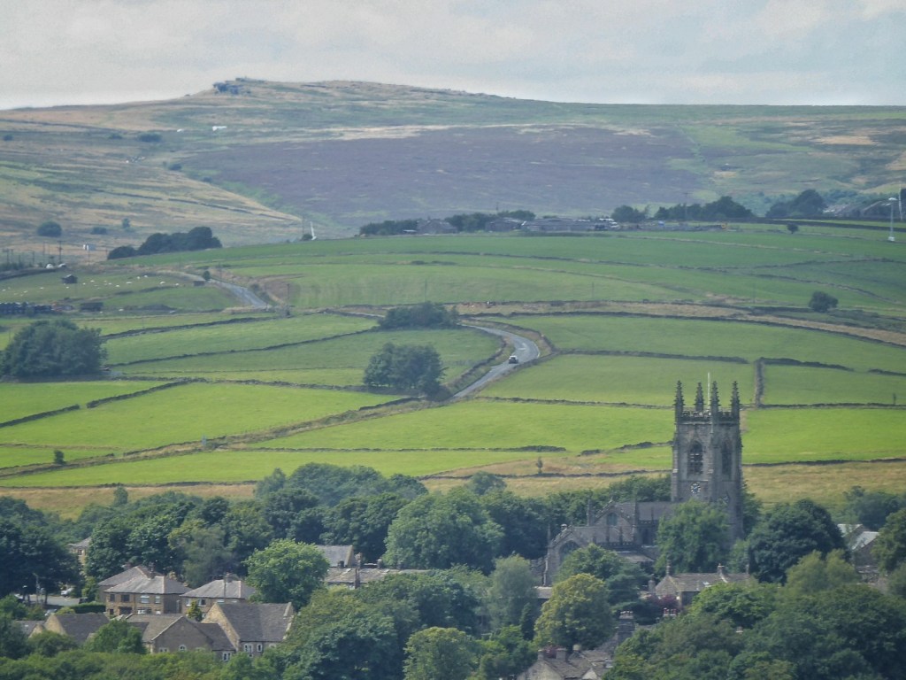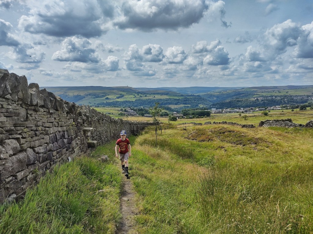 Wadsworth | Up through Nutclough Woods and out into a greener landscape that has slaked a little of its thirst with a few days of blessed rain since the heatwave, not something many regions were gifted. The wide, overgrown Keelam Lane delivers us to the moor, where the topmost intake wall is fringed with a bounty of bilberries, which my son devours with the studied commitment this tiny fruit demands. Only a red kite sailing overhead, its forked tail pivoting as it finely adjusts itself on the thermals rising from Old Hold Edge, can distract him from his task. Until, that is, Ed comes striding past, crook in hand, dog working hard beside him in the heat, gathering a flock of Lonk sheep off the moor. Lonk are the traditional local breed, and Ed and his wife Laura, together with knitwear designer Nic Corrigan and British wool expert Dr Zoe Fletcher, are working together under the brand Wool Circle to create traceable Yorkshire yarn from this now rare breed and redeem something from the bewildering situation of British wool being worth next to nothing for farmers. Once he has penned the flock in his field we stride back to his pickup with him, talking of the innovative business model they are developing, how they have recently taken on another local rare breed, the Whitefaced Woodlland, the difficulty of renting scattered parcels of land and the uncertainty around the new Environmental Land Management Schemes. He issues an invitation to visit as he races off to see to a calf. We carry on along the swells of the moor, behind Old Hold farmhouse which floats free on the moorland sea on its unusual island of fields untethered to the main body of enclosures, before stepping ashore again. A pigeon clatters from a wood, followed by a kestrel, which had presumably spooked, if not threatened, it. We stalk the kestrel for some time as it shifts from telegraph wire to pole and back to wire in the blaze of the lunchtime sun, before being pursued ourselves by cattle as we cross a rough pasture from one lane to another. Old Laithe Lane, though, proves worth the gauntlet we just ran, with the richest harvest of bilberries we have yet seen this summer. He sets about reaping and further blackening his hands, lips and tongue, giving me time to look about and spy, in a far, moorland-abutting pasture, the first ever Belted Galloway cattle I have seen in these parts. Another rare breed now becoming popular with farmers looking to move away from competing in mainstream commercial markets, as well as for ‘conservation grazing’ on nature reserves. I wonder whose these are. The Old Town Post Office cafe is abuzz with England’s win over Sweden in the Women’s Euro semi-finals last night – in the time we sat there with our brownies, three separate customers, while ordering at the counter, enact spirited imitations of Russo’s sensational backheel goal, which must have been slightly sore for one of the women serving them, who it turned out had actually been at the game but at the wrong end of the pitch to see the already-legendary move. After descending back to Nutclough, then re-ascending to the cafe to retrieve my son’s Harry Potter magic wand and bemusing a dry stone waller as we pass him three times in quick succession, we drop back down the hill, on the way stopping by the Birchcliffe Centre to collect my haymaking books from Francesca and having a chat with the author Amy Liptrot about swifts and summer. Finally, we pop into the Town Hall to see Will Lake‘s marvellous exhibition of landscape photographs of the Lakes, Morecambe Bay and our own Calder Valley. We chat and find much in common with our love of this landscape and its fleeting light and shadow, which he captures in a way I can only aspire to.