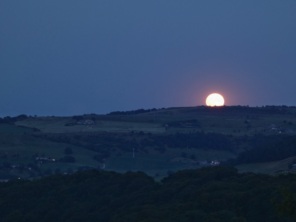 Moons | Despite the fading light there are still a good 25 of the 30 degrees the day accumulated to contend with, so I leave half an hour for a slow, measured climb up the hill before the Moon is due to rise at 9.13pm. At the gate, I settle to wait and drink in the stillness. I note that the Moor and Home fields across at Edge End have been mown and the headlands already baled, with the rest waiting for rowing up tomorrow. I’m enjoying the anticipation of the 99.7% full Moon making its appearance. Belatedly, it occurs to me I can work out more or less exactly where it will heave itself over the horizon, and take my compass out. Bother: at 127 degrees it will rise right over the mast above Hebden Bridge. Not an ideal view. I know where I’ve got to move to now, and fast. So much for the gentle pace. I hurtle up the lane, through the hamlet of Lower Rawtonstall and up to Badger Lane, scratching and stinging my legs on thistles and nettles that crowd the path I can barely make out in the gloom. But I’m just in time: a peach glow heralds its imminent cresting over the far side of Cragg Vale. Suddenly there is a glint among the fine furze of trees and here it comes. Unlike when it rises over our much nearer horizon from home, it takes its majestic time breaching this far one. A bat flickers past, its leathery flapping audible in the evening’s held breath. But I barely register it: the Moon is magnetic, holding all my attention…until…until I turn my head away from it at a pale flare to my left, and am confronted by the face of another moon. A barn owl is silently beating across the rough field across the other side of the lane. As it crosses the wall, it turns and bears down on me, the dark craters of its eyes seemingly unseeing, so squarely is it facing me, so undoubtedly will its course bring our faces into collision. But I do not turn away; ducking does not occur to me. I am not sure if this is due to confidence that it will register me in time or a refusal to be the one to blink from this encounter and miss a millisecond of it. Thankfully, it is the one that blinks, and banks, and traverses across the Moon six feet from my own face. I follow it all the way down along New Lane’s hedge of mixed conifers. My camera was in the middle of a four-second exposure as it passed, but if it did cross the zoomed-in lens, it left no trace of its passing.