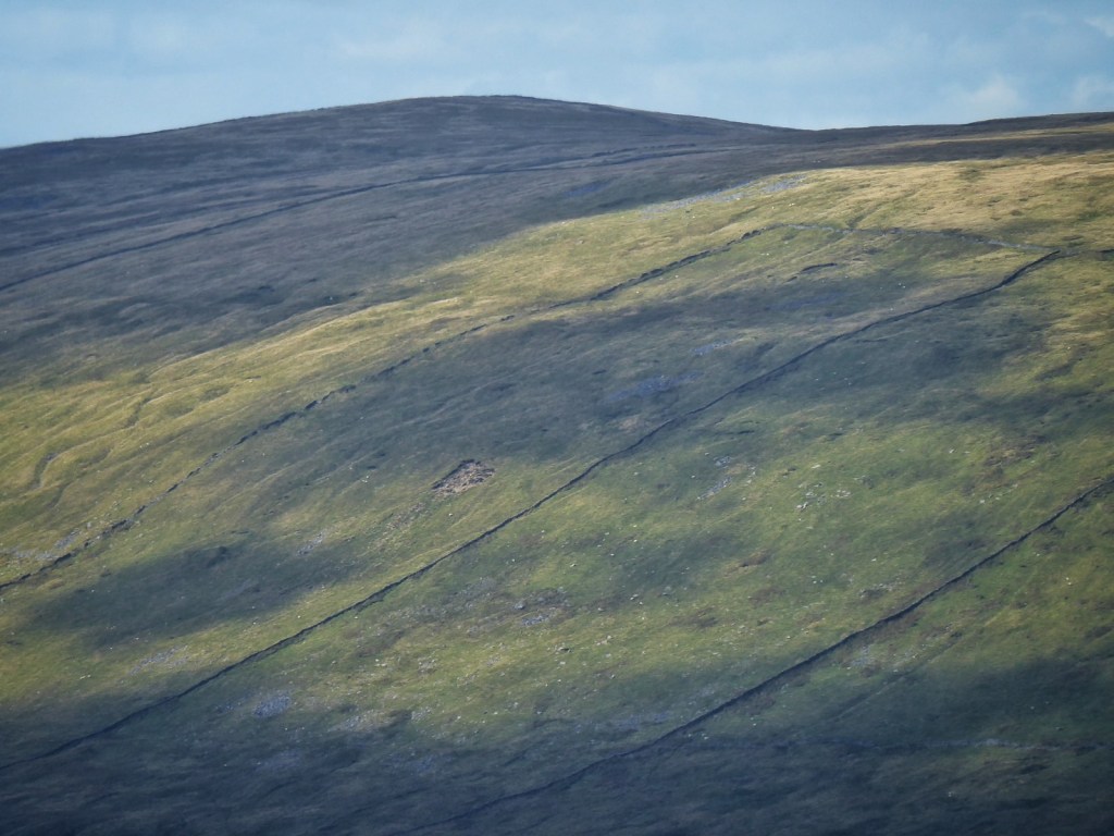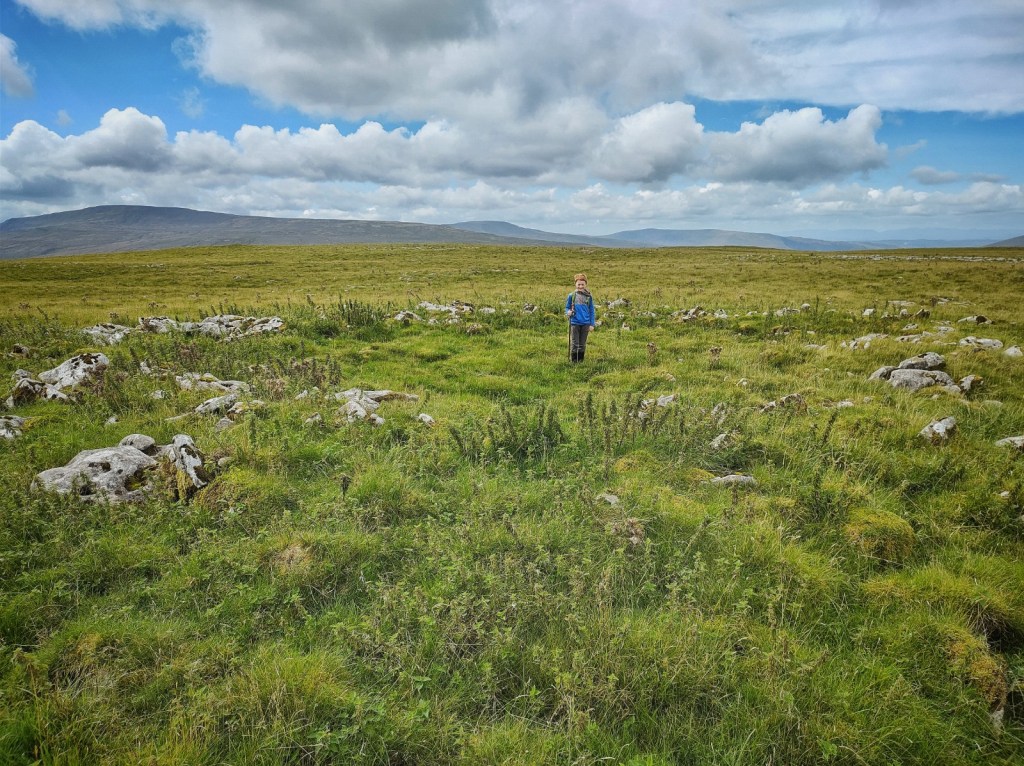 We cross the head of Arten Gill, mount the shoulder of Wold Fell and pass through the gate that allows us access to its 200-acre plateau. I show my son the reference photos I took in 2013 to allow me to relocate precisely where the stone belongs, and he sets off on the hunt; he’s sad that the stone will no longer be in our possession, but as keen as I am to get its restoration exactly right. We find that the collapsed section has been repaired, which puts a different complexion on one of the excuses I made for allowing myself to take it. But after marvelling at the little shells and skeletons that stud its surface one last time, we slip it between two ‘waller’ stones – for its role is as a piece of infill between the two outward-facing leafs – in as exact an approximation of where it came from as we can. Task completed and conscience salved, we set off across the tabletop summit for a little explore before our return walk.