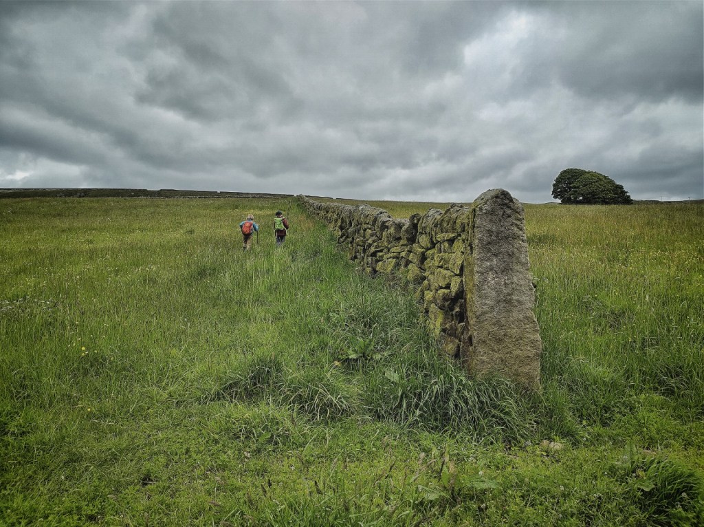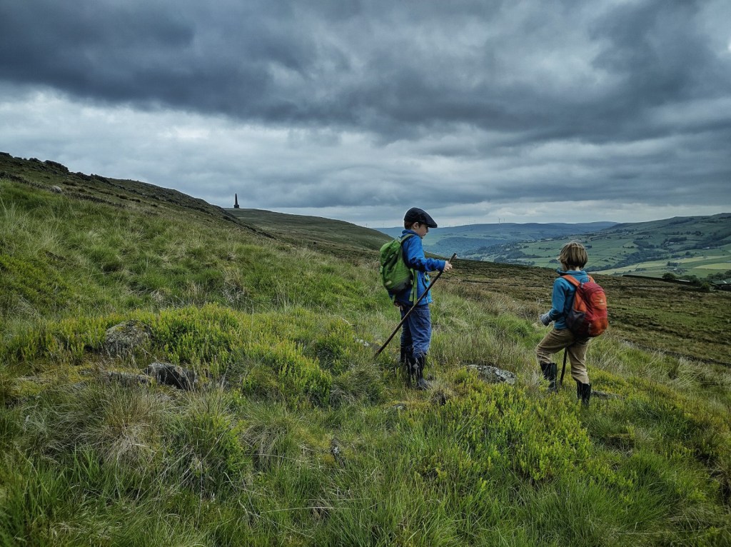 I only allowed them a few yards on the easy, well-trodden path from Stoodley Pike before plunging us off it and down one of the few remaining stretches of the 14th-century Erringden Deer Park’s ditch-and-bank boundary, at the bottom of which we found an enormous horned sheep’s skull, which they agreed to share custody of. They kept up their uninterrupted stream of chatter the entire way round, moving seamlessly from exchanging designs for new Star Wars spaceships to finding geocaches (one on Pinnacle Lane and one at Johnny’s Gap), from crouching and examining little caves under rocks to inventing gnome-like characters to live in them, complete with the attire they would wear and the weapons they would carry.