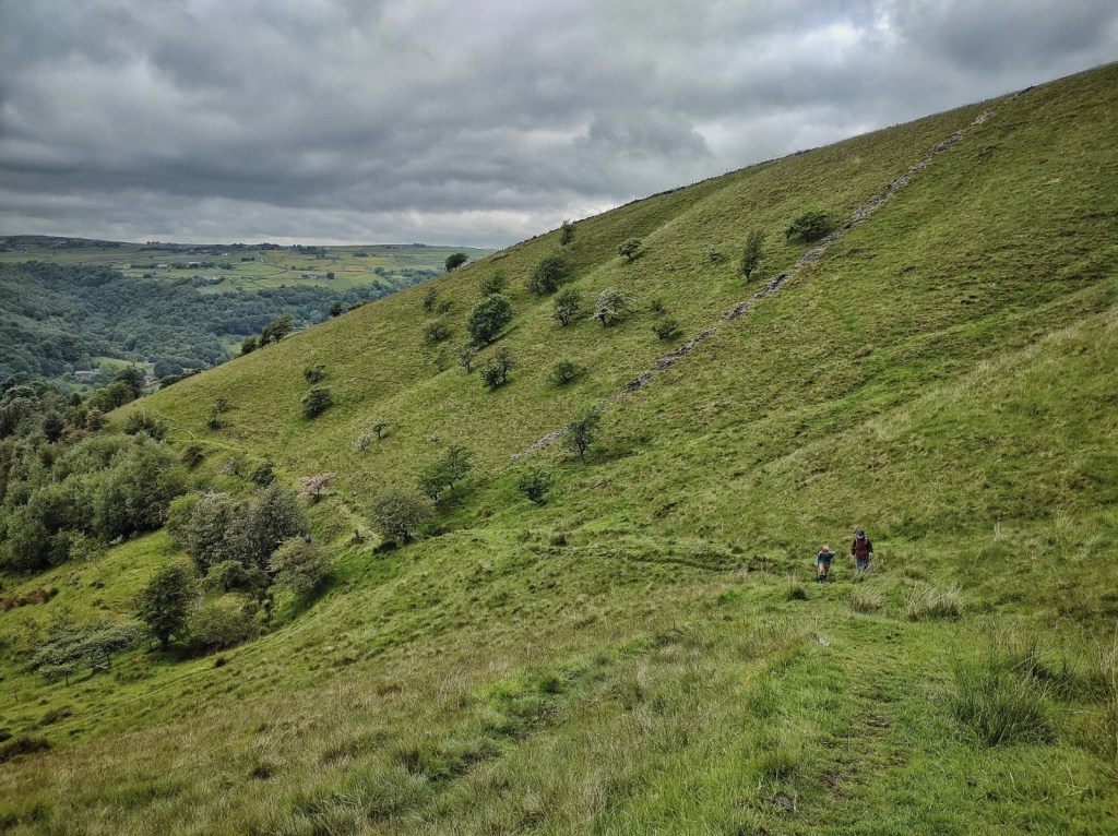 My imaginative powers evidently being greatly diminished as an adult, I could not join in their play to any great extent, but I am glad I was able to lead them through a landscape that proved fertile ground for their play, for we did not compromise on our usual habit of tramping the wilder, less frequented paths, with an ascent of Foster’s Rake to the Domesday settlement of Cruttonstall and its crumbling 17th century farmhouse, before mounting the muscular shoulder of Lodge Hill and bullying down through the rushes of Edge End Moor to Lower Rough Head.