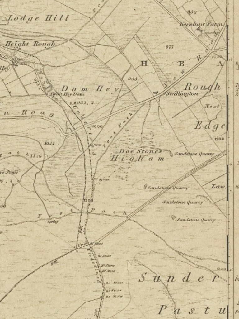 After a peer down the gurgling field drain that funnels the stream to Beaumont Clough and a lunch break sitting on an enormous prostrate gate stoop in Pinnacle Lane, we took to a right of way that I think must be one of the least used in the whole valley. There is simply no need for anyone to want to ascend the rush-choked, boggy, pathless rise of Rough Edge from Swillington to the site of the vanished house at Johnny’s Gap, since both ends of the route are served by good tracks. But I had spotted something intriguing on the mid-19th-century OS map that made me want to take this route: a very irregularly-shaped, one-and-a-half-acre enclosure that is granted its own name, Nest. I know of no other like it, either in shape or in the stature apparently accorded it by being named.