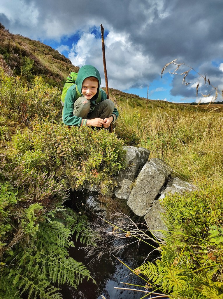We have already, this morning, climbed up the wooded confines of Jumble Hole Clough, ascended the steps of the old dam in Hippins Clough (Jumble Hole’s upstream continuation), and searched among the sneezewort and the foxgloves tipped by the very last of their flowers for what I have billed to my son as The Smallest Bridge in the World. It is so small, and the stream here so narrow and overhung with late summer growth, that it takes a few passes of the short stretch I recall finding it along a decade ago to re-locate it. Upstream and downstream we scour, until it magically appears. He is not disappointed by my build up, and peers underneath for miniature trolls and hangs off the tiny arch made by its seven small stones to pluck some curiously pear-shaped bilberries before they plop into the water.