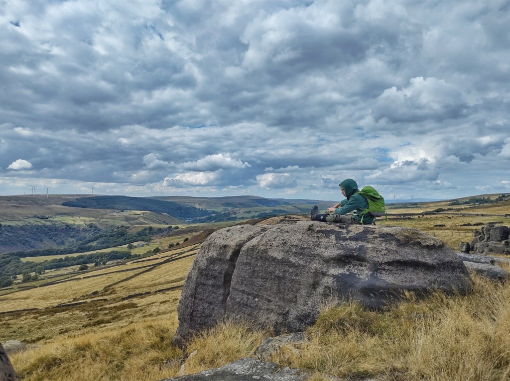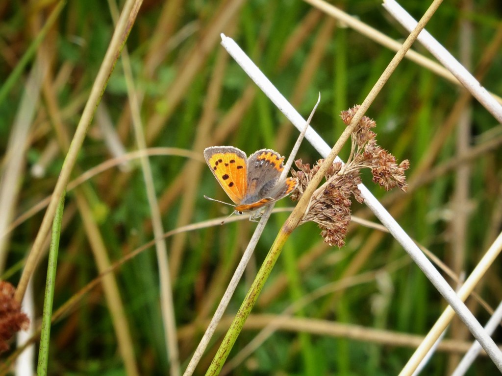 After a clamber and a close look at some impressive funnel-type webs of the labyrinth spider among fissures in the stones, we descend under the Whirlaw Stones on an ancient track of worn causeys – stopping to admire a small copper butterfly among the rushes – to their two namesake farms; West Whirlaw a crouched ruin, East a smart working farm. We meander through a remarkably large area of scrubland, pitted and patted by an unseen herd of cattle, hidden somewhere among the blackthorn and hawthorn, both clambered over by dog rose and blackberry-laden bramble. It is a good harvest this year, and we encounter a forager giddy at his bucketful of black bounty. We complete the walk with foraging of our own in Todmorden, with cake in the Market Hall and a raid on Lyall’s secondhand bookshop before the bus home.