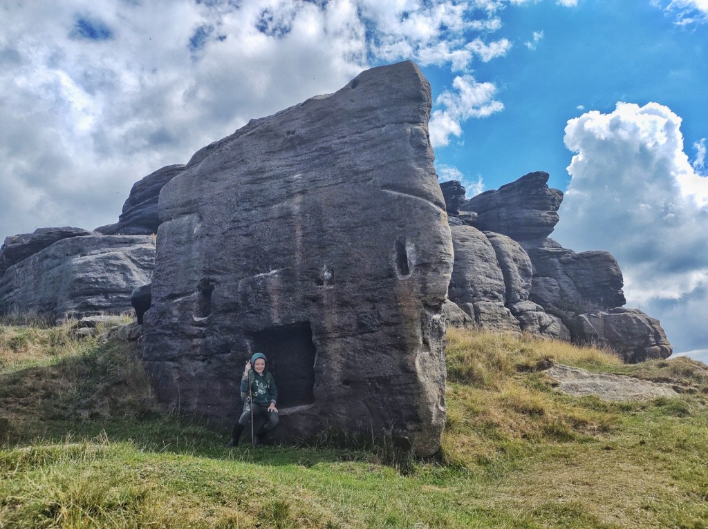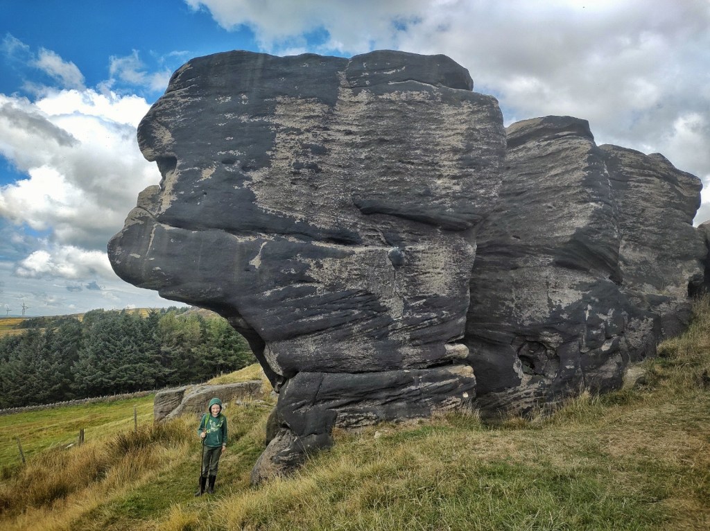 After spending some time emptying heather and grass seeds and other accumulated moorland detritus from our boots, we spend a happy hour gliding on short-cropped grass among the famous gritstone outcrops, seeking out all those that have been bestowed titles and resolving their resemblances as best we can: Toad Rock, the Indian’s Head, the Hedgehog Stone, Elvis Rock, The Bottleneck Bride, as well as the curious carvings that once supported a house at Fast Ends.