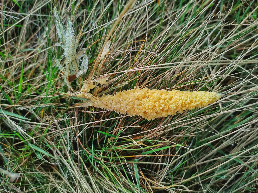 A 100-strong flock of fieldfares fresh in from Scandinavia settles in the crown of another sycamore. My son is as rapt as I am, but while we’re watching them he manages to also spot a kestrel stooping among the windswept hawthorns on Lodge Hill and an egg shell slime mould at our feet. Neither animal, nor plant, nor even a fungus, it is crystallising on a few tufts of grass like hoar frost, and is the first slime mould he has seen. He prods at the sticky couscous substance with wonder. Its life cycle is incomprehensibly strange, starting as single-celled, amoeba-like organisms, which combine to form a plasmodia, which then actually moves in search of food, before coalescing into spore-releasing fruiting bodies. But we are back with the familiar that afternoon with a neighbourhood conker tournament.