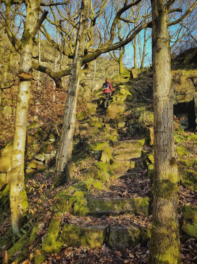 The neighbourhood of Eaves is working through plans to celebrate the centenary of its first houses next year, and debating ways of bringing its old mill ponds back into use. But while its string of houses, perched on the remains of the mill terraces and the site of old farm cottages, has just lost the gilded afternoon light, its namesake wood on the slope above is still awash with it. Its Victorian steps and stone-edged paths weave between the glowing beech, and the rocks of Hell Hole quarry are a radiant green-tinged gold. An insistent, deep-throated, rhythmic chant comes from its ledges, where duelling male pigeons strut and ruffle up their neck feathers at each other. A party of jackdaws crash the scene, silencing the pigeons, who smooth their feathers so the light can dazzle off their amethyst and jade iridescence.