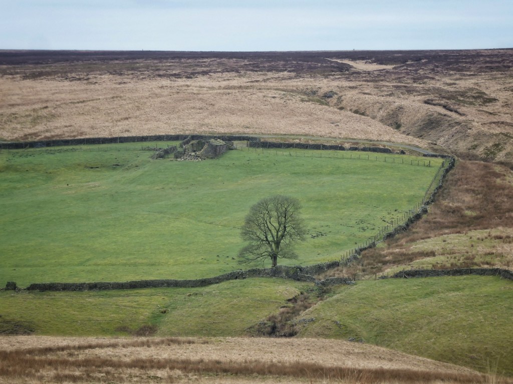 Mare Greave was among the first of the farms to go. Inhabited at the time of the 1851 census, it is marked as empty in the following four and is absent altogether from those carried out in 1901 and 1911. The Ordnance Survey maps tally with this timeline of abandonment and suggest irreversible collapse or substantial demolition between 1891 and 1893; after appearing on the first edition of the six-inch OS map (sheet 215) surveyed between 1847 and 1849, the site is marked by a field tree between a couple of remaining walls in the first edition of the 25-inch map surveyed in 1893 (CCXV.1) and has disappeared entirely by 1905.