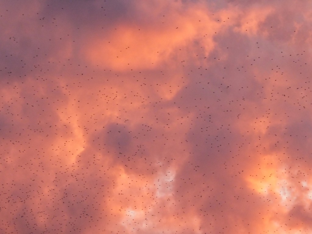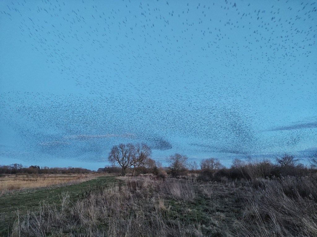 But they do not do anything as undramatic as land, or descend, or even fall into the reeds. They are sucked. A vortex has opened at their chosen site and in a dizzying, funnelling spiral they are drawn, pulled, inhaled within. There cannot be room for more in those few square metres, yet still the whirlpool drains thousands more downwards. But now a competing site has been proposed in a neighbouring reedbed. Suddenly the supply of starlings to the first roost is starved as momentum to the new site grows. There is indecision as fence sitters turn the line of scrubby willow and hawthorn that separate the two possibilities into soot-black, spiky sculptures of trees. And then the deliberation is over and the decision is made, and the trees are revealed again with the suddenness and showmanship of a stage magician whipping a cloak away to reveal an apparated rabbit; the branches whip and sway as the weight of untold numbers of birds spring away to the newly-favoured site, and those thousands that had already found a good perch within the first now blast through the hedge in a corkscrewing, braided helix of whirling energy. It takes short minutes for the sky to empty, the reeds to blacken and the spectacle to end. The birds, until now silent but for the waterfall-surge sound of their wings, chatter in their language of static-and-whistle radio interference, and the watchers, sated with a display of nature’s abundance now all too rare, dazedly drift away into the twilight.