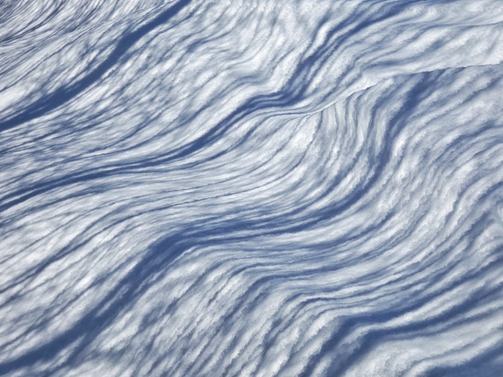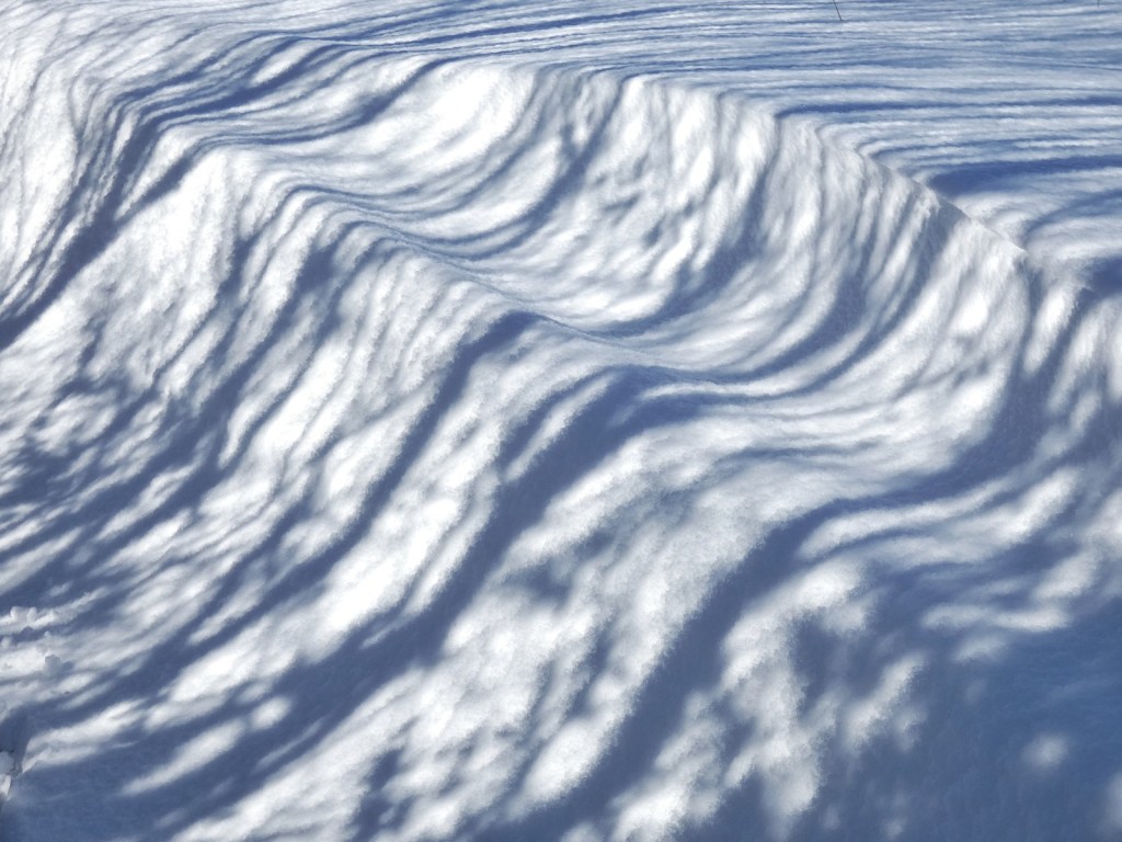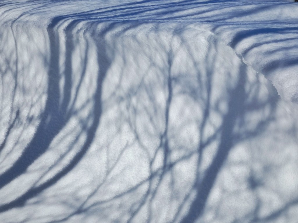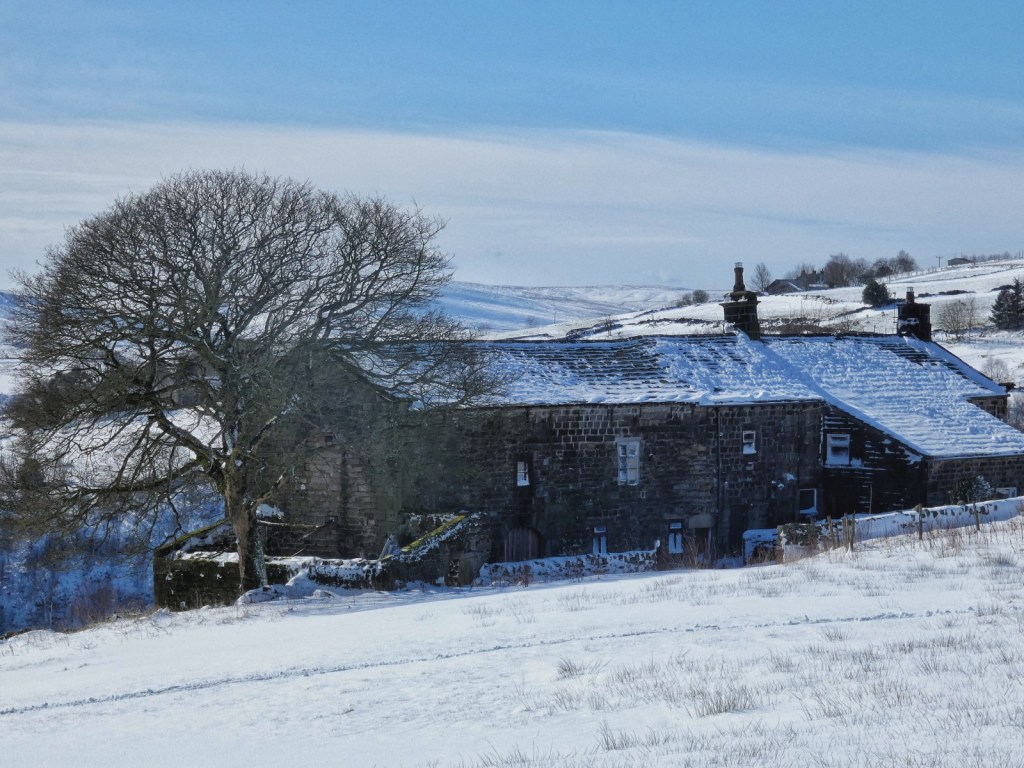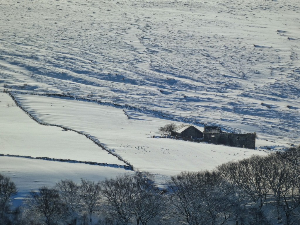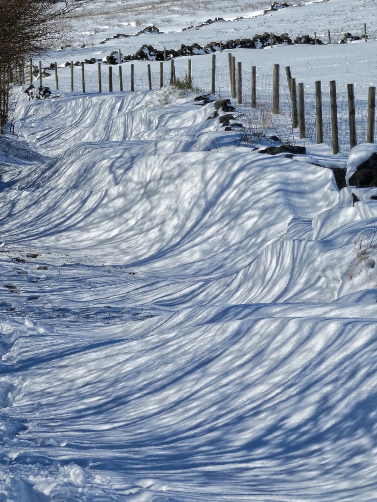 In the woods, the plastered hollies are bent low over the paths, but they are soon unburdening themselves of the weight they carry; as the warmth of the sun asserts itself through the morning, there is the slap, pat and slump of snow sliding off branches. Slender tree shadows drape themselves over the drifts on Dark Lane, and the sheep leave mazy tracks in the Home Field at Edge End Farm where the hay has been brought out.