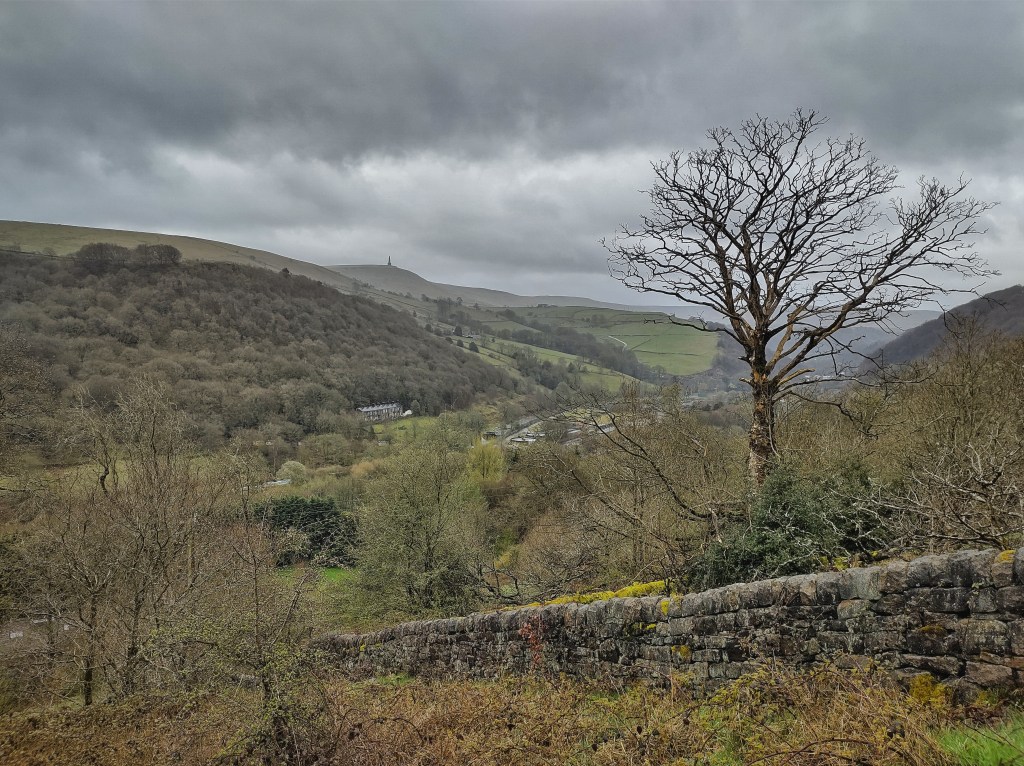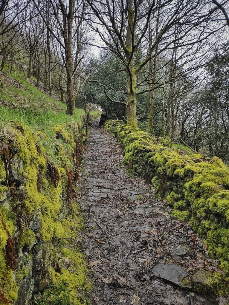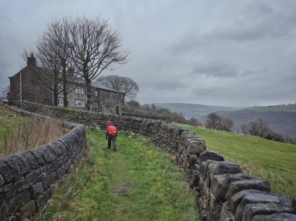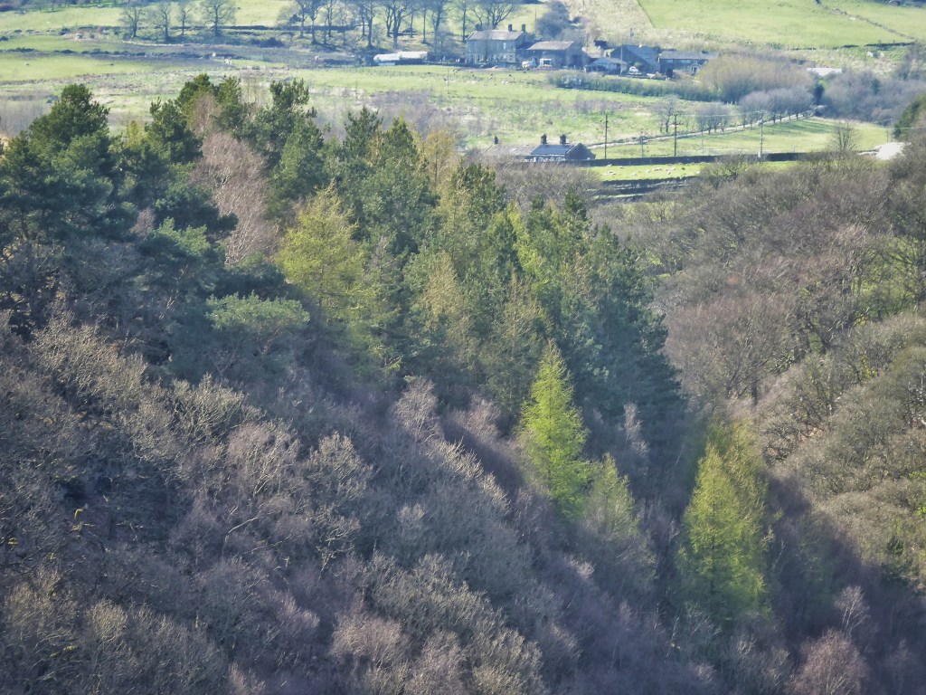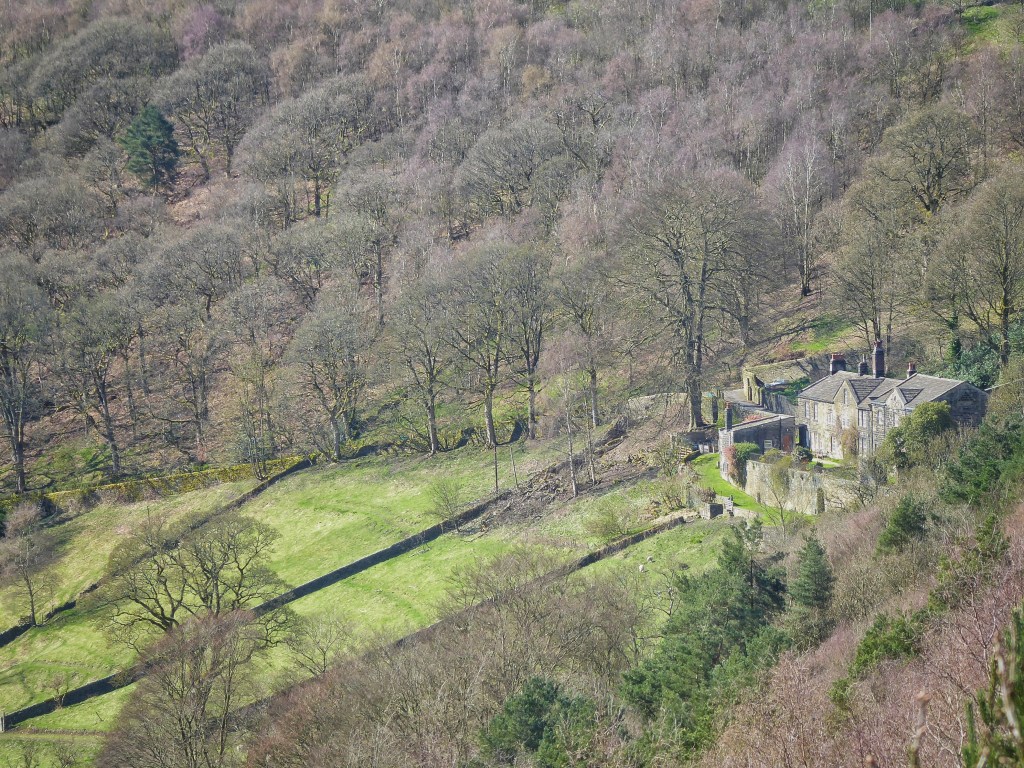 Heptonstall is perched on a peninsula, a headland created by the carvings of the Colden and Hebden waters. On the western, Colden side, the afternoon sun bakes the still leaf-bare Eaves Wood. Rising thermals bring spring scents of warming earth and a buzzard, spiralling and soaring into the sun. Larch, already out in their fresh baize green, bristle on the shoulder of Dill Scout’s Wood across the tributary valley. Below them, the weathered sandstone of the two chimneys of the Lumb Mills are the same colour as the trees they tower over. Crowds labour up the long ascent under the heather- and gorse-clad slope of The Whins, carrying jumpers in the sudden warmth as they head for the final, merriest performance of the day.