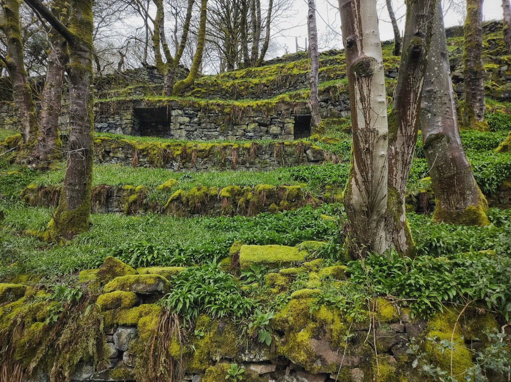 But this whole hillside is wilding on its own; the bee-boled terraces of Beverley End are a riot of ramsons, the cemetery of Mount Olivet, its chapel long gone, has not had a burial since 1932, willows are prising apart what is left of Higgin House, and the fields named on the 1774 estate map of Underbank House – Long Pasture, Well Field, Orchard Field, Great Pinhill – are now overtaken by oak saplings and bramble. It is 30 years since John was the last of generations to keep chickens and grow vegetables on terraces which are now clothed in bluebells under maturing woodland. A roe buck, its antlers sheathed in velvet it will never thrash off on the nearby rowan that has been stripped in the past, lies newly dead under the hollowed-out bower of holly that has grown back in the century since photographs show the oaks with no understory to speak of. The paths of its kin show as much use as the human paths they cross. The bathtub in Peter’s old pig field is seething with tadpoles, and the tracks he used to drive his tractor down grow every year narrower as the leaf litter banks up against the crumbling walls.