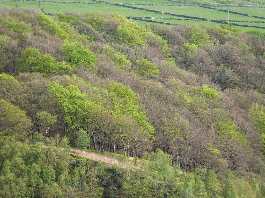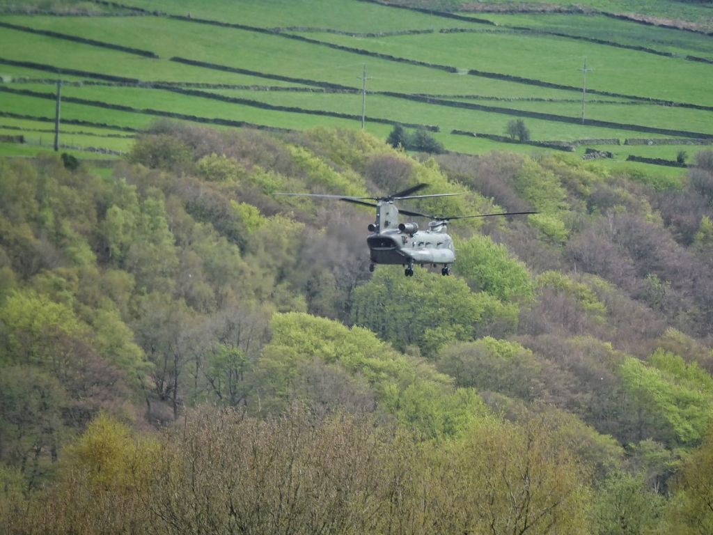 A Chinook helicopter rumbles over, or, rather, through – over Slack before dipping into the gulf of the valley level with Steve’s field, the heat haze from its exhaust blurring the chequerboard green and brown canopy of Horsehold Wood’s beeches. It rises over Edge End Moor, using Stoodley Pike Monument as a navigation buoy at which to make a turn into Withens Clough.