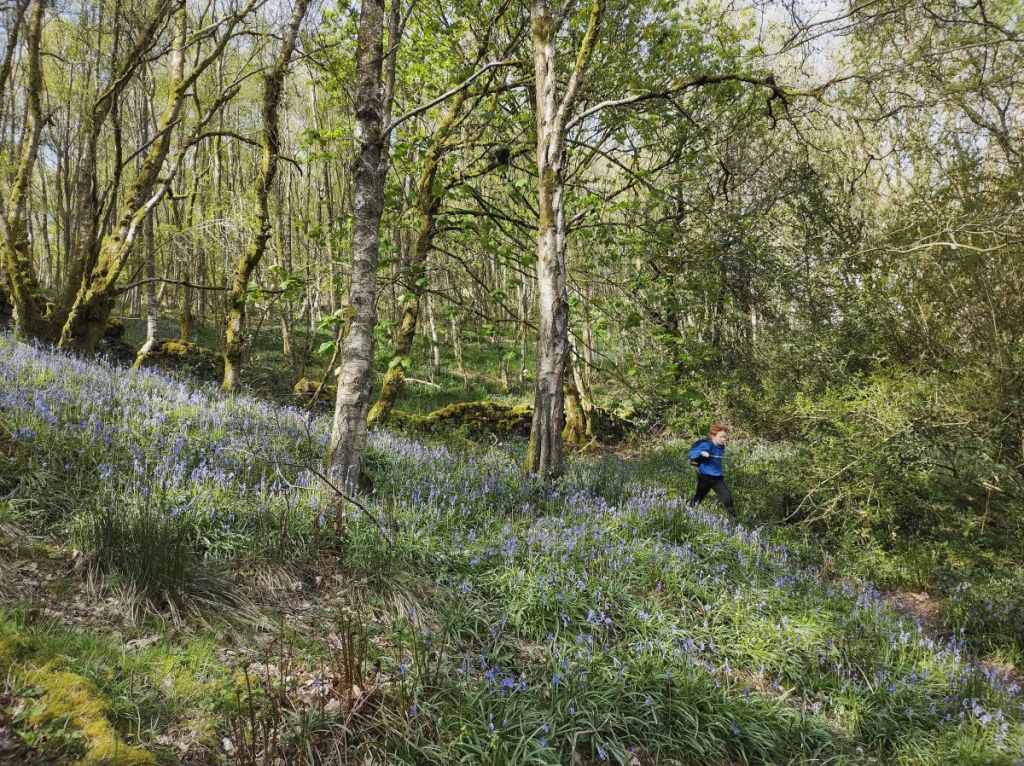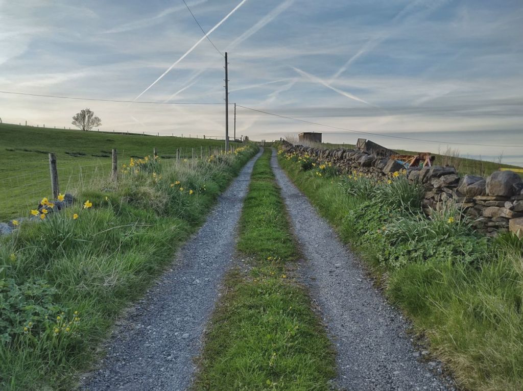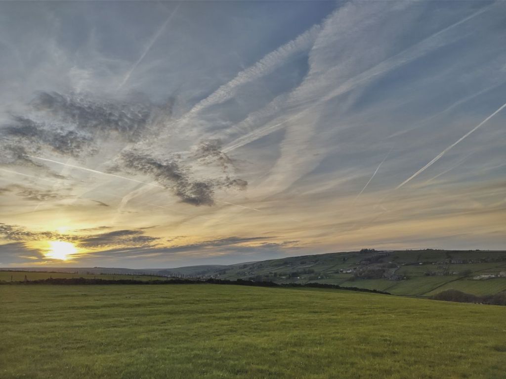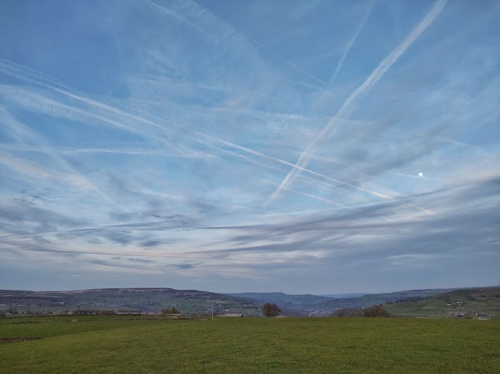 Later that evening, there is a season’s difference between the valley and the tops. Above the bluebells in Knott Wood, not far now from their peak; beyond the emerging meadowsweet on Dark Lane, and the brassica-like ash flowers and the egg-yolk marsh marigolds in the ditch and the intricate new stile that CROWS constructed last week; on the other side of Pry Farm, where David’s curious, flighty herd of bullocks gallop beside a meadow spread with pungent muck, daffodils are still in full bloom on Badger Lane and a raw, numbing wind scours the hill. Curlews swing back and forth across the sunset. Under its glow through a smudging of cloud, Greenland Farm crouches on the shoulder of the moor. Unlike the pristine skies of lockdown, the sky is scratched with contrails, claw marks which miss the Moon by inches.