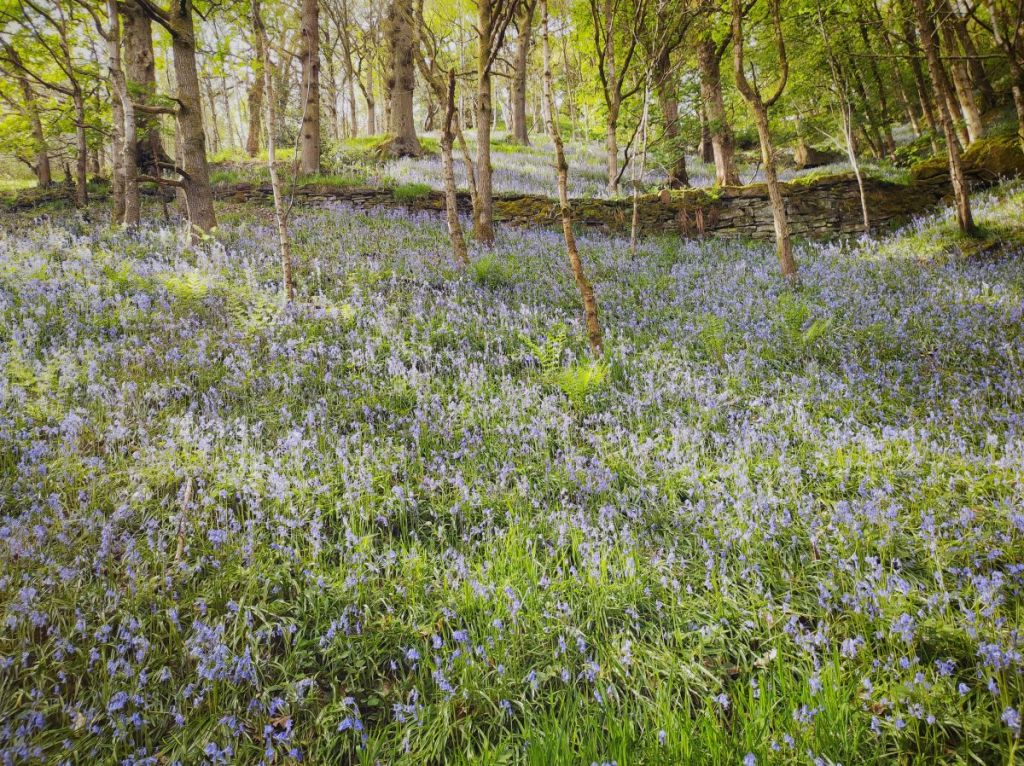 Two days later, the Knott Wood bluebells are 24 hours shy of their peak, with a few flower buds still to open and their lavendar blue on the cusp of deepening with shades of indigo. But they are still magnificent. They wash down the hillsides and break against the oaks. Their scent wafts in waves on the rising warm air. Thin deer trails meander through them under Peter’s maturing woodland on Turret Brink. The white foam of wild garlic flowers tumbles down among them on the sled track from Castle Hill quarry. They are a cobalt haze, like slow-moving dawn mist, under the young birch in Old Hall Field. Soon they will be spent and their lush leaves will fade through the summer into raffia and their black seeds will rattle and spill. But for these few perfect days, they are a British woodland’s finest moment.