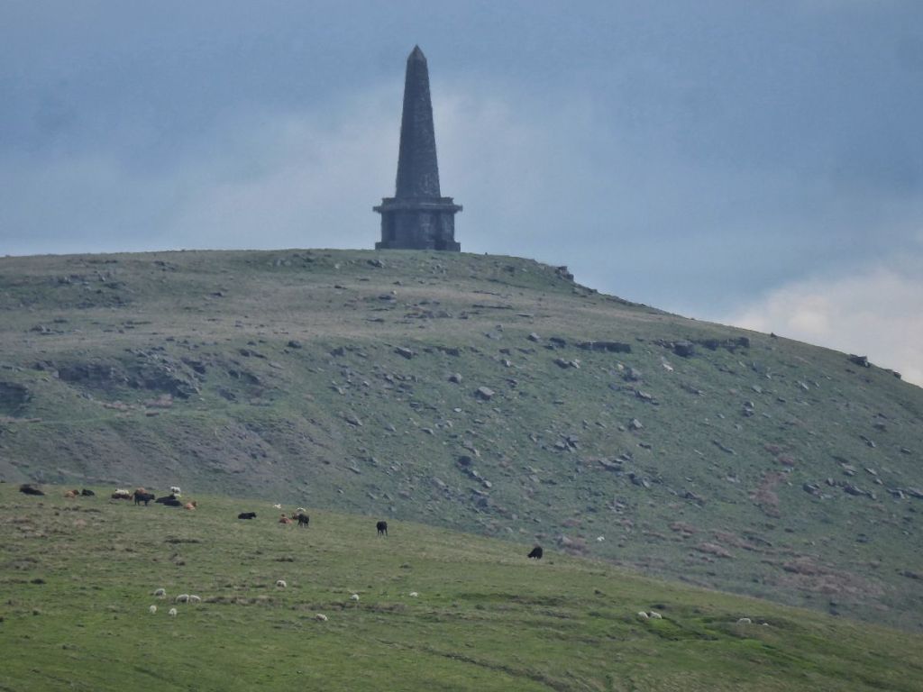 Edge End cattle on their namesake moor, and Stoodley Pike Monument.