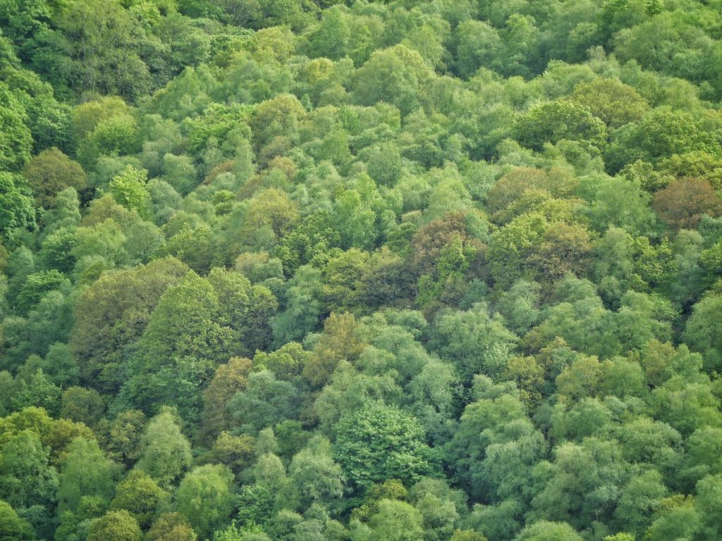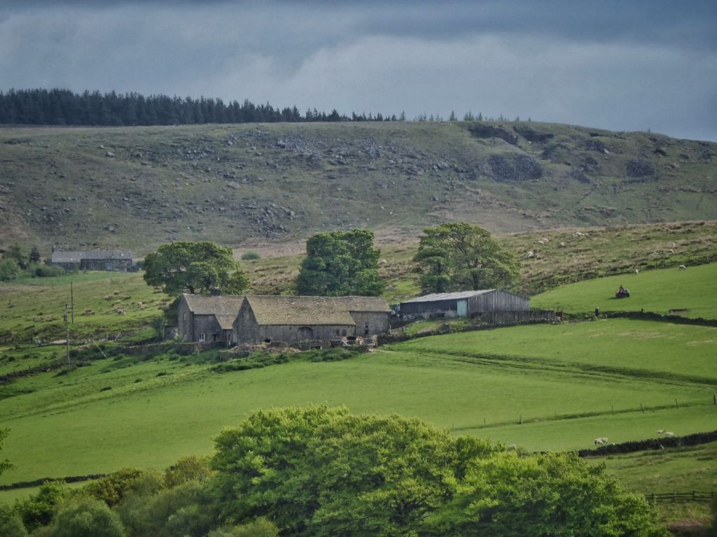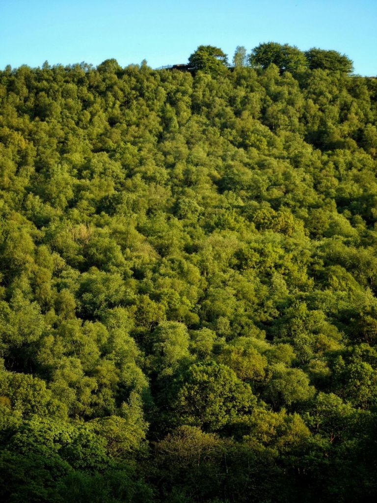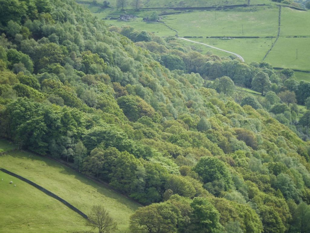 Callis Wood under Callis Nab, with Parrock Clough and the ruin of Burnt Acres beyond.