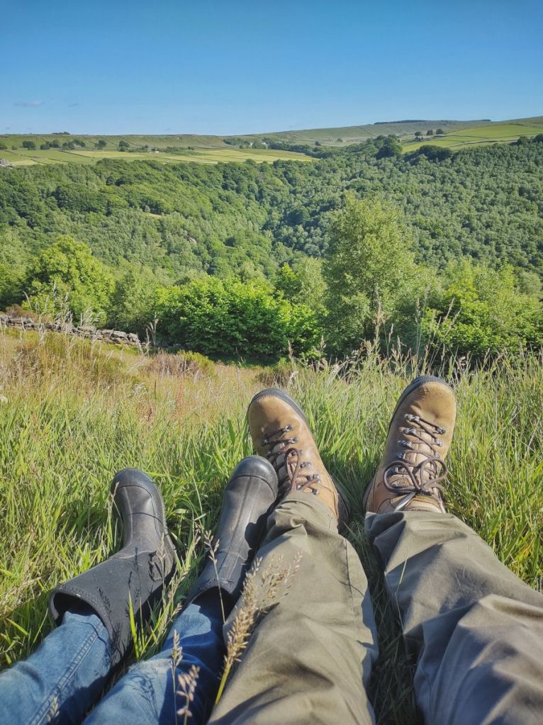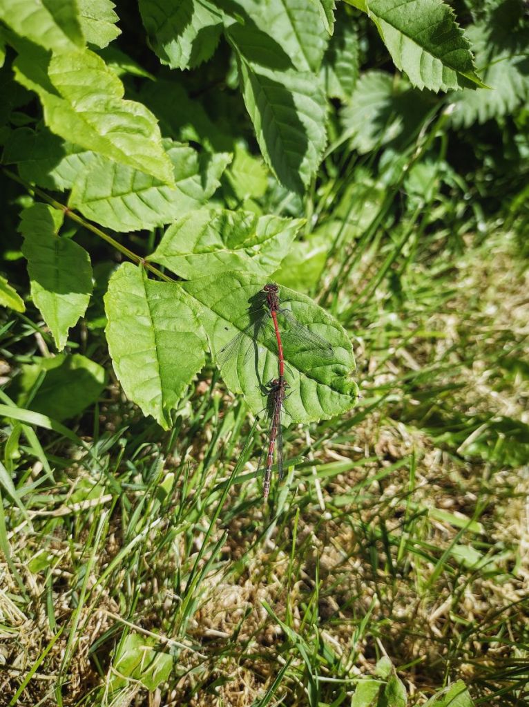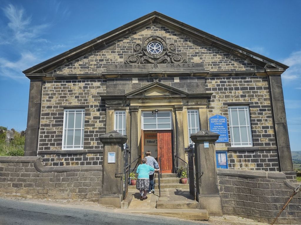 Down the hillside and off the roaring tractor highway, below Steep Lane Baptist Chapel, which is welcoming its congregation and anyone else for coffee, scones and light lunches, the fields are much smaller. Steve’s farm, a haven for wildlife, has some of them, and among the trees above the exceptional Bethel Methodist Chapel with its Doric columns and conical towers, a much smaller tractor with a spinning haybob is turning the cut grass for greater drying time. Further down Boulder Clough, a pair of large red damselflies mate on a leaf beside the reservoir at Swamp Mill, where a father and daughter fish together.