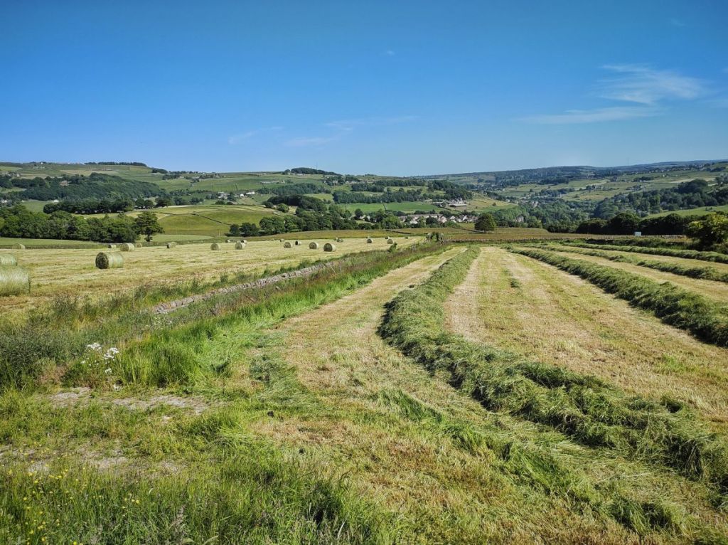 But the current economics of upland farming necessitates efficiency and scale, and this is on display today too. Part of the substantial dairy herd of the Hitchens at Old Crib is grazing on the aftermath, or ‘fog’, in the already-cut-and-baled meadows that sit atop Scout Rock. What were six enclosures in the 19th century have now effectively been merged into one, with some walls having vanished entirely and others so tumbled they no longer form a barrier to the movement of the stock. The dried compacted muck on the tarmac of the Long Causeway testify to the herd’s twice-daily journey to the milking parlour. The Hitchens produce good milk with minimal external or artificial inputs, but while it is no ‘mega-dairy’, it is significantly larger than the small dairies of the past, with the original farmhouse now surrounded by modern barns, and to keep the herd grass-fed as much as possible through its winter inside, a large volume of silage is required. To this end, three tractors with gargantuan trailers thunder back and forth between the farm and the meadows on Long Edge Moor, where rows of grass cut yesterday are being hoovered up by a forage harvester and spewed into the trailers as they move at pace alongside. Even with three tractors to attend to it, though, the harvester is idle for short periods in between, its engine humming in readiness, but otherwise the brief pauses allow the usual peace of skylarks and curlews to resume. Rooks probe among the cropped sward and a lonely, loose wooden fingerpost swings in the wind, beckoning to the far horizons that fade into the white skies of the south.