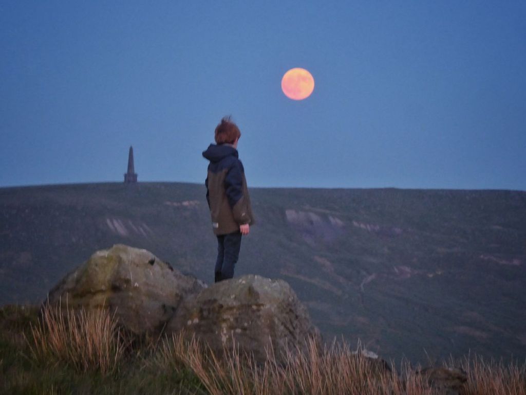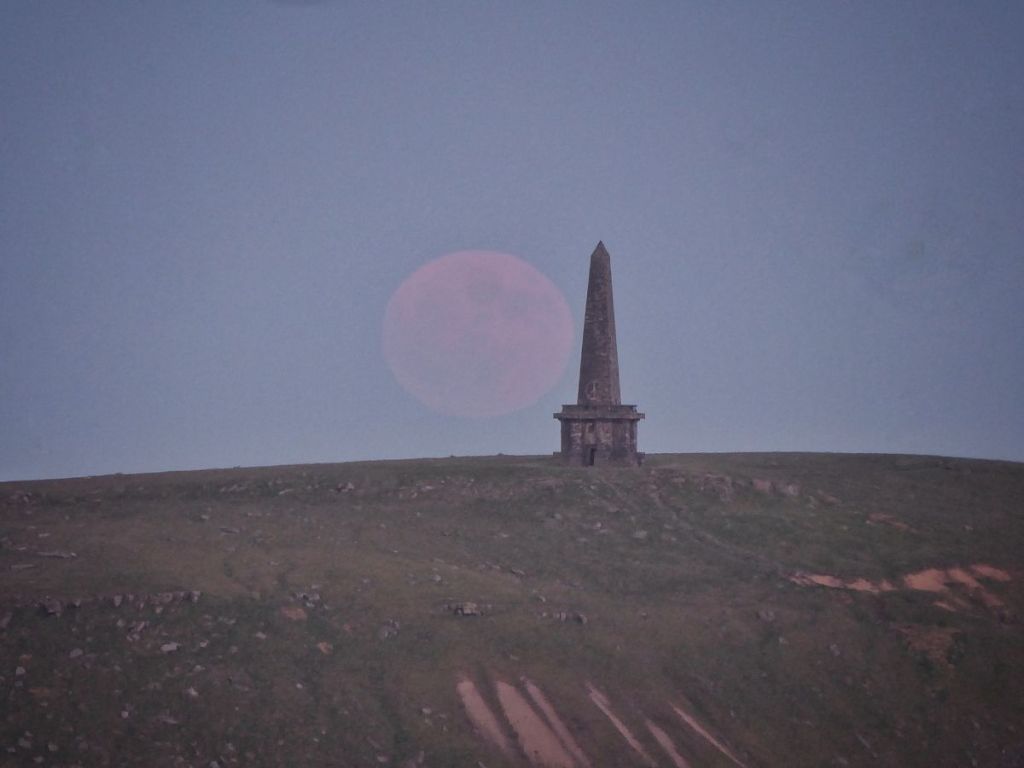 But its setting is mirrored, only minutes later, by a magnificent rising, as the full moon looms over Stoodley Pike Monument. It is rose pink, not far off the colour suggested by its Algonquin name of the Strawberry Moon, so called for the ripening of that wild fruit in the tribe’s territory in June. Faint at first, peering through the brume on the horizon, its lustre grows as it climbs, ponderously, over the tip of the monument’s spire and on into the dimming grey.