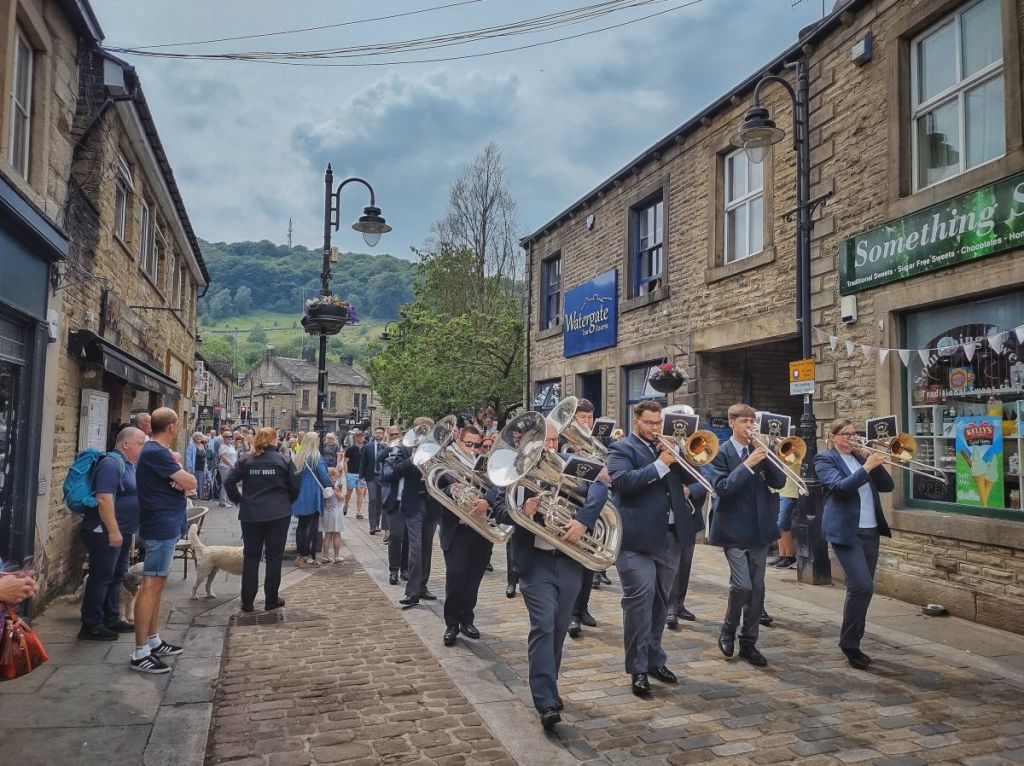 As the clouds gather again, the fitful sun gleams on the brass and silver of the 15 bands at the Hebden Bridge March Competition. They somehow stay ahead of the weather, and under swirling house martins the ‘blindfolded’ judges (hidden in a van with open skylights so they can appraise by ear alone) award Hepworth Band 1st prize with ‘The Wizard’ as their march and ‘The Day Thou Gavest, Lord, Is Ended’ as their hymn, though Lancashire’s Wardle Anderson Brass Band’s rendition of ‘Ravenswood’ rouses the crowds in the town square to thunderous peals of applause.