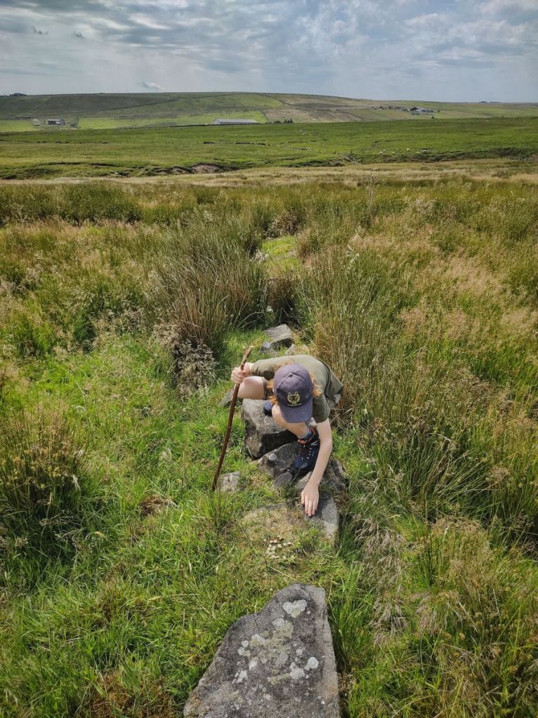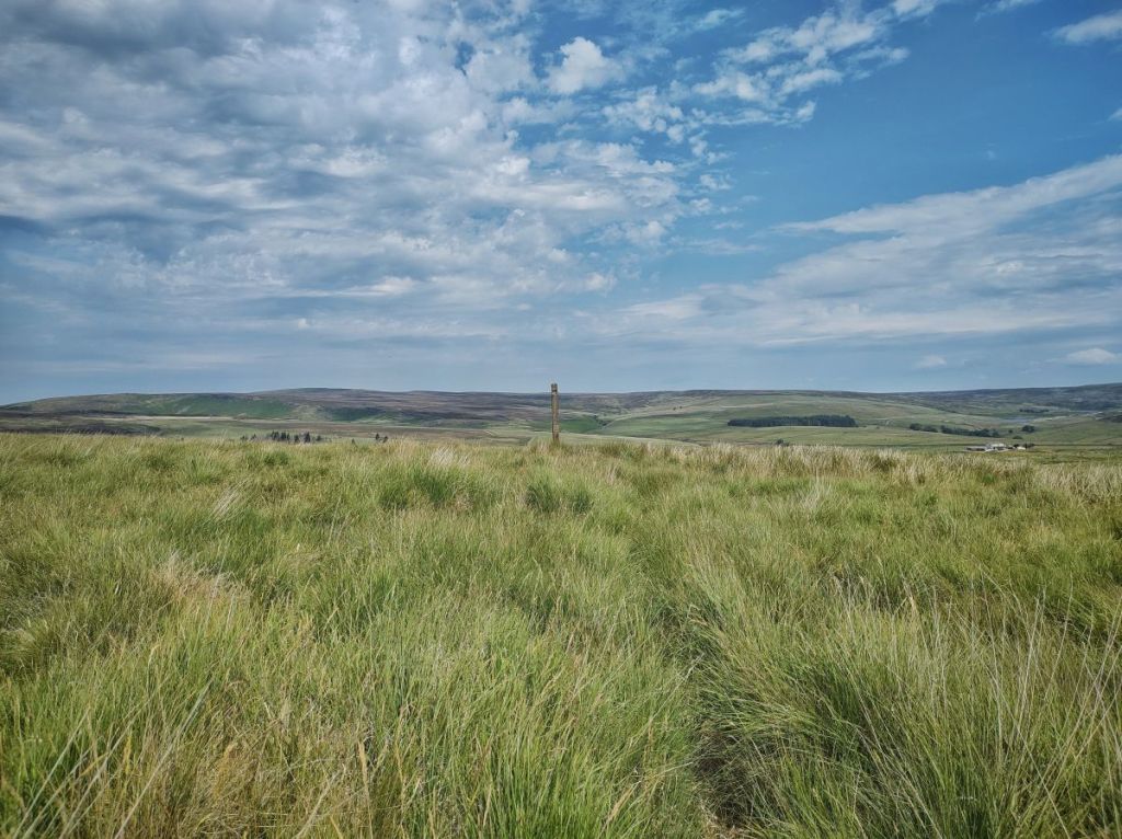 On the other side of its remarkable intake wall, with its three layers of throughstones and which separated the dark moors from the Butterworths’ hearth, white waving cotton grass periscopes up from the green sea of Molinia, and the gentle moorland horizons shimmer in the heat haze. A brown hare bolts to the base of the medieval Reaps Cross and down the hill towards the remains of the farms that bear its name. The shattered parts of this 14-foot ancient stone waymarker for a road long lost were removed from the moor in 2000, repaired by local stonemason Jim Gault in accordance with standards set out by English Heritage, and returned in 2002 to stand in magnificent isolation, no longer showing the way to anywhere in particular, but a destination in itself. Clusters of the pink bells of cross-leaved heath jingle on neighbouring Standing Stone Hill beside its eponymous monolith. Red grouse chicks skulk among the heather in the still-damp maze of the Black Mires.
