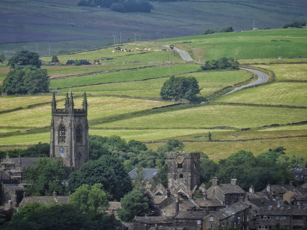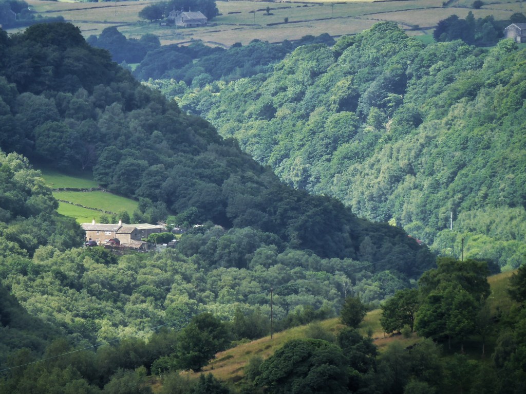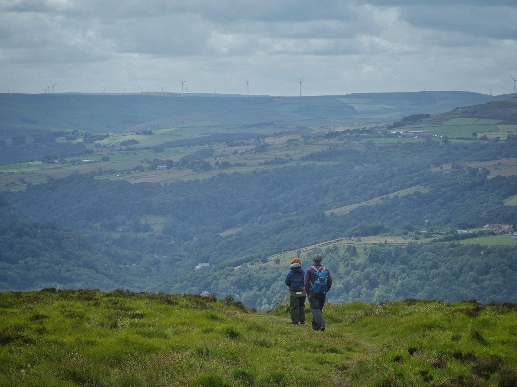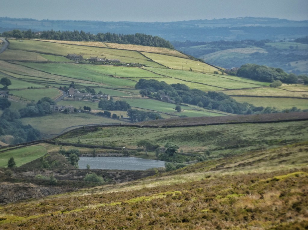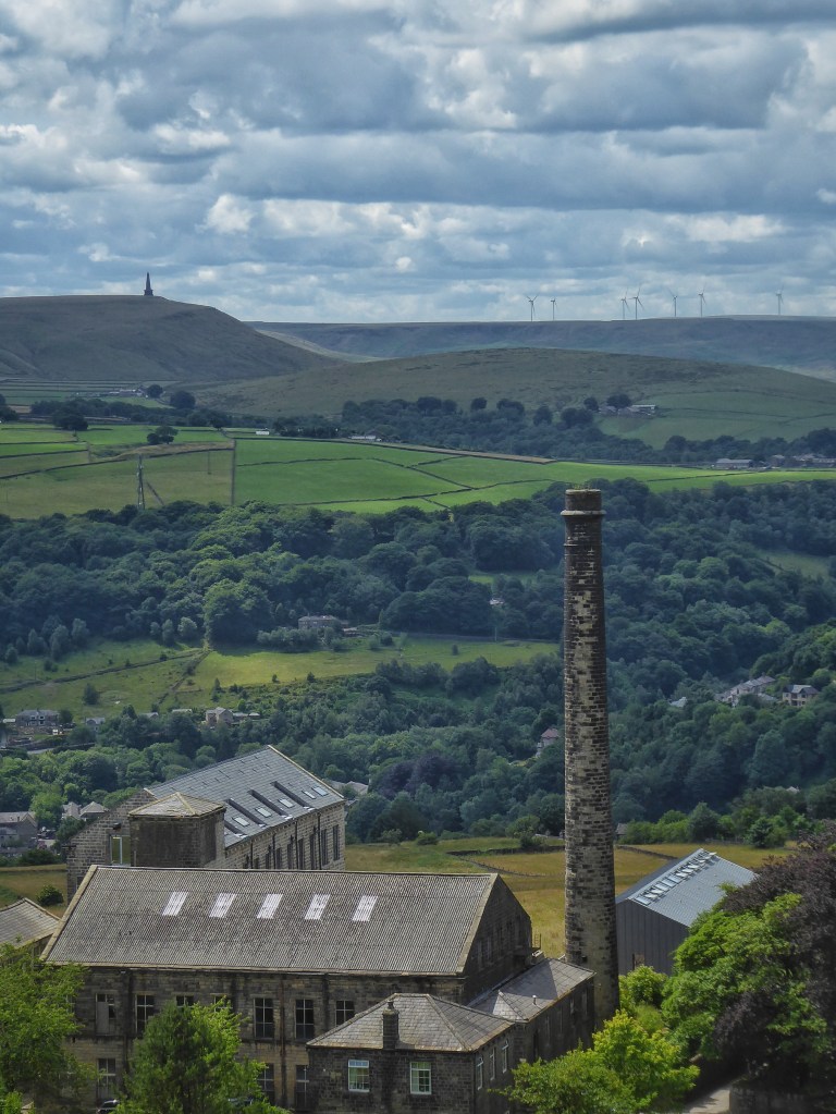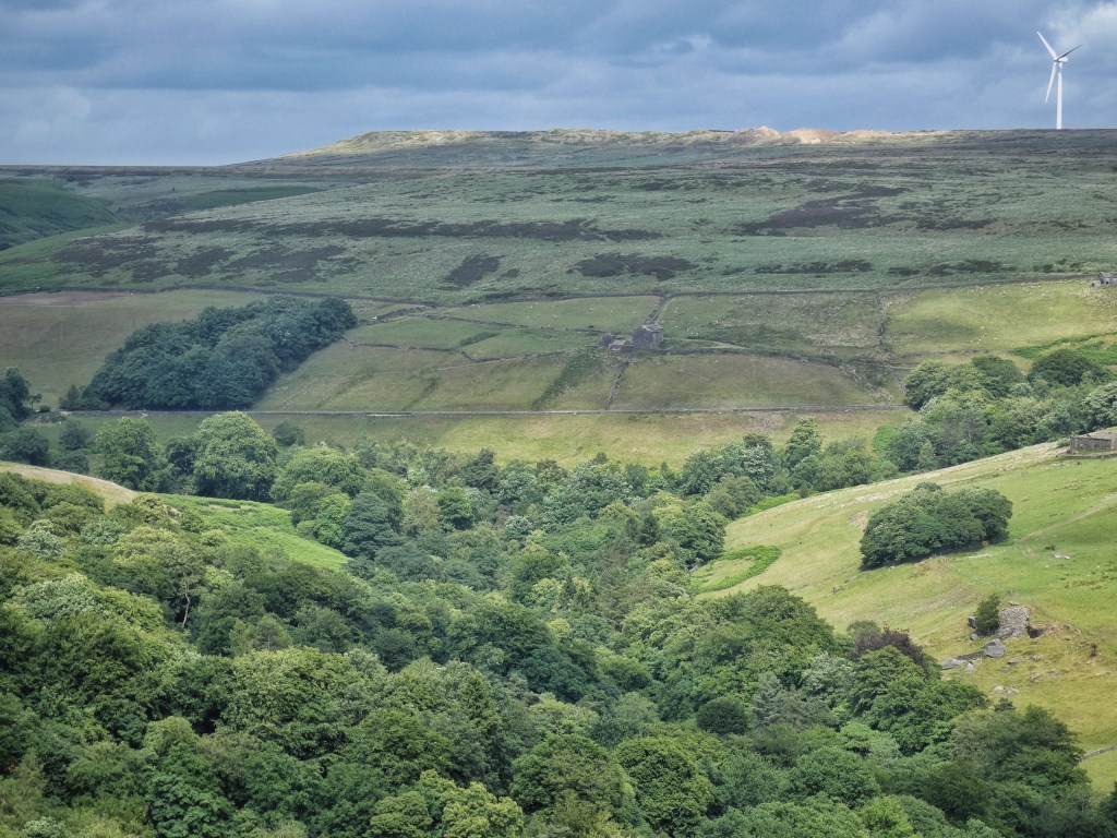 On the headland that separates the two basins in the Wadsworth hillside, one cradling Delf End and one that cups Chiserley, the Butterworth’s two-bladed turbine spins next to the reservoir that once supplied the mill at Old Town and beside which two bathers, newly-emerged from its choppy waters, are drying themselves. Swallows and a swift hawk above the birch and rowan scrub of the coal-pit-pockmarked Wall Stones Flat, greenfinch rasp from the wind-whipped wires and wood pigeons feed on the exceptional crop of bilberries that have healed the quarry-bitten fringe of this tentacle of moor, seeded in the spring by the honeybees hived behind Wainsgate Chapel.