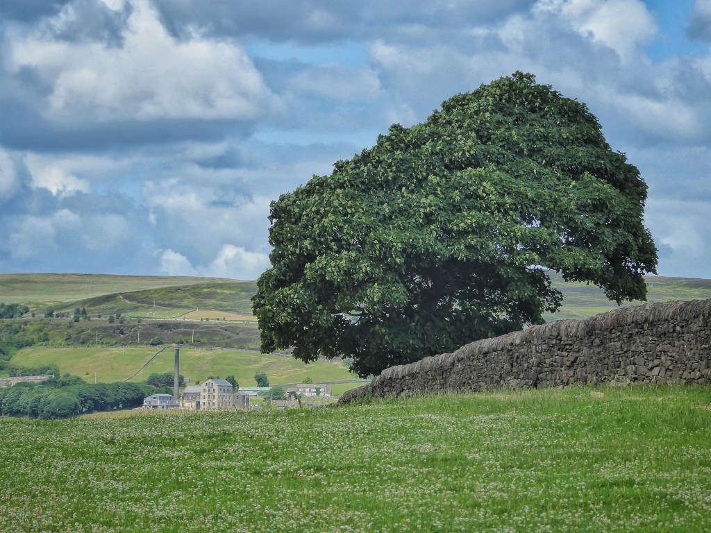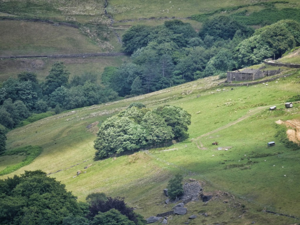 Across the valley in Erringden, between Pinnacle Lane and Kilnshaw Lane, a string of diamond-shaped enclosures stocked with ash and sycamore each provide shelter at four field corners. These meadows, part of the Reverend James Armitage Rhodes’ 19th-century remaking of this landscape for his model farm of Erringden Grange, are thick with red clover and yellow rattle, waiting for Elaine to judge that the time is right to preserve their summer goodness for the lean months of winter. Her Swaledale sheep, the lambs considerably grown now, graze in the pastures above Kilnshaw Lane, the half-diamonds of their enclosures at the top of the slope now sadly empty of the trees that were marked in them on the 25-inch OS maps from the 1890s through to the 1930s, their exposure on the margin of the moorland plateau evidently shortening their life compared to their lower counterparts. Opposite the grand farm is a collection extraordinary specimens, their decrepitude a demonstration of the rigours of this climate – a hawthorn bent at a right-angle near the base of its trunk, one ash with a portion of its trunk’s bark soughed away, another with a sagging limb split clean through, a third bowed entirely over, propped on an elbow with space enough under the arch of its prostrate body for a pair of lambs to pass through to their mother.