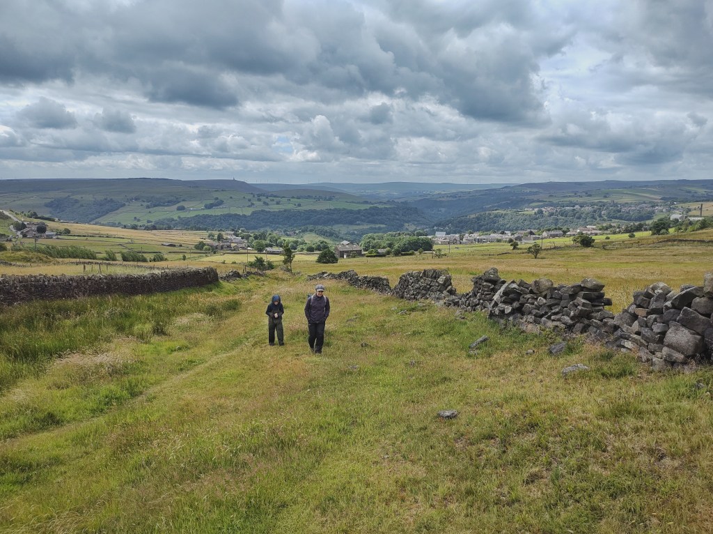 Along the lane, Mark and Sheila’s maturing acre of woodland that climbs the edge at Kilnshaw shows that trees will still thrive here, although it does not reach the height of Erringden Grange’s empty enclosures. Above it, the exposure has taken its toll on the walls of David’s fields, their many gaps testimony to the labour that it would once have taken to keep them stock proof. A willow leaf, blown here from some distant part of the parish, is trapped between two coping stones, which lean like books in want of a bookend. The wind passing through the gaps under the apex where the two stones touch and grasp the leaf vibrates it against them, its dry brittleness resonating at the frequency and pitch of a Geiger counter. A skylark counters the harsh clicking with its endless song of summer.