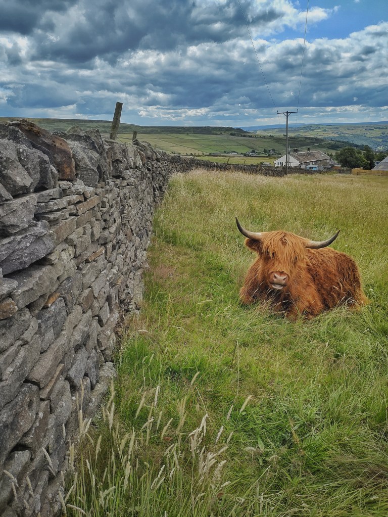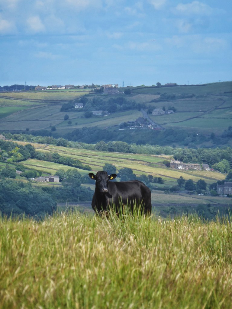 Crows are harvesting the same bounty higher up on Bog Eggs Edge, squabbling and flighty in the wind, rising in uproar at every gust. Above them, a kestrel hunts along the brink of the plateau, its chick yickering from its nest among the surging Scots pines at Weather House. The parent approaches with its catch, teasingly circles above the trees then stoops straight into them, temporarily silencing the chick. A flurry of fat drips is blown across Aberdeen Flat to slap against the cap of the first ventilation shaft of John F. Bateman’s Castle Carr Tunnel, nettles and a vigorous spear thistle growing from its base. A red admiral takes shelter under the lintel of a window that remains in the ruin beside it, its mottled underwings blending into the lichened gritstone. Only a pair of Highland cows, sitting under a zip wire above Allswell Farm and contentedly chewing the cud, seem unmoved among all the lively commotion around them.
