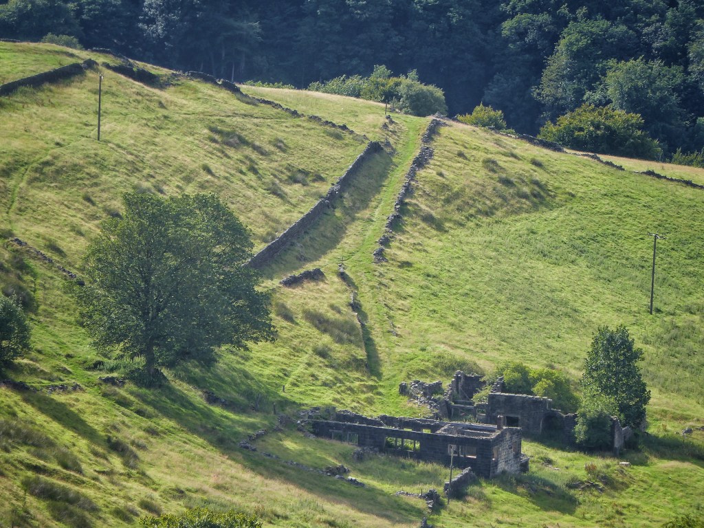 On the Stubbing Brink hillside, sunk within a forest of ferns and hogweed within which paths are cleared for the canine patrons of the Leads Away dog park, is the boundary of a different kind of park, a deer park from the 1300s. Still marked on the 19th-century OS maps with an ‘S.R.’ for Sowerby Ramble – an administrative vestige that survived until 1850 – it remains the boundary between the civil parishes of Hebden Royd and Erringden and is clearly visible on the ghostly negative images of Lidar maps, and in some satellite images. There are no dogs rampaging over this old threshold today, just a froglet inching up the cobbles of the path that arrows up to Horsehold Road, the black seed pods of vetch on one side, foxgloves that have all but fizzled out on the other. Honeybees are hurrying in and out of the multicoloured hives in the field above, hopefully sensing and responding to the headlong rush that the plants seem to be in to finish blossoming, and set and scatter their seed.