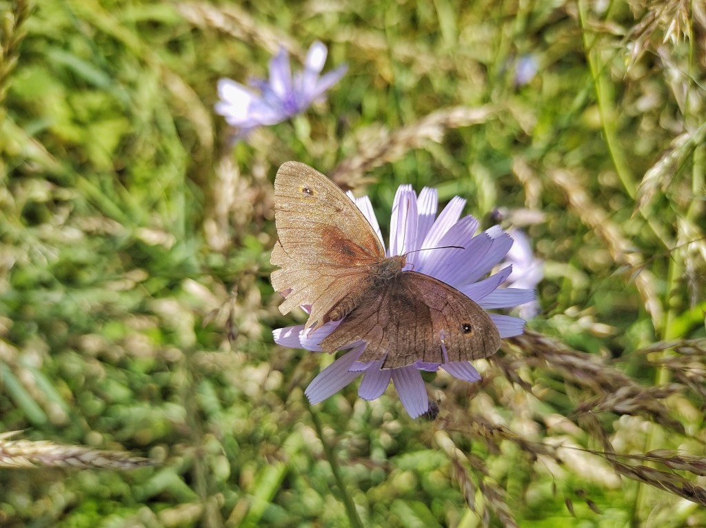 Meadow brown on a common blue sow thistle, Pinnacle Lane.