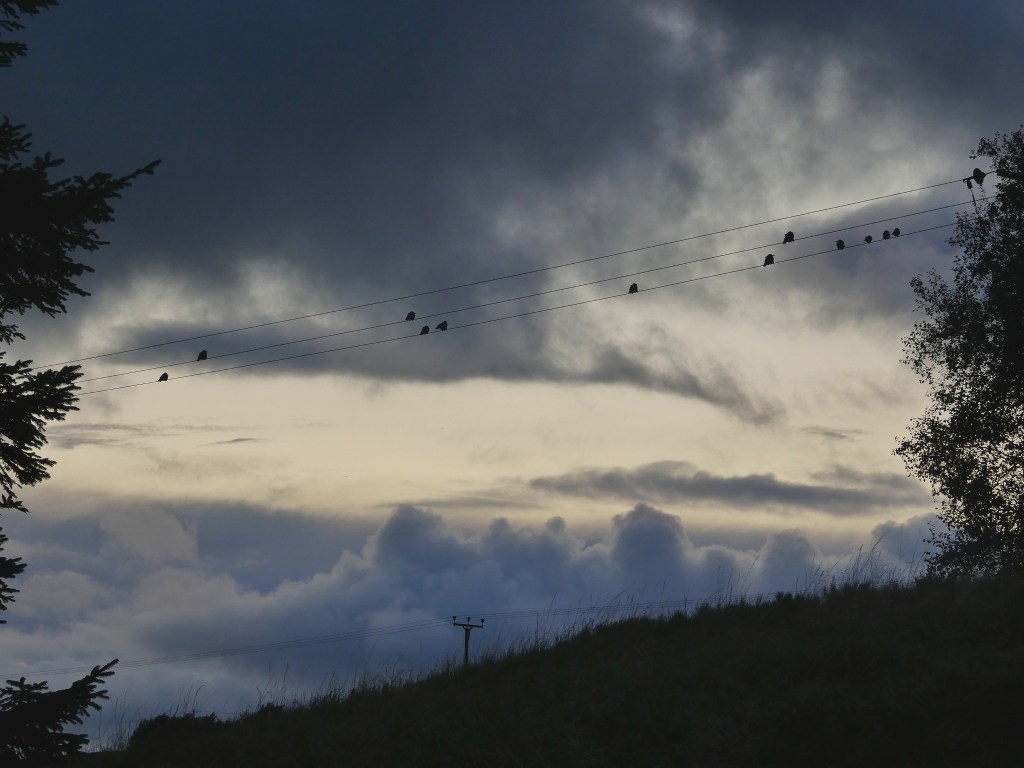 Some days later, the temperature drops and the dusk is distinctly cool. With nesting season more or less over and many species moulting, there is no longer an evening chorus and the woods are almost bird-silent. The occasional click of a wren alarm, thin ‘seep’ of a blackbird or shy snatch of robin song are the only glints in the gloom. But at the edge of the woods, above the lip of the valley-within-a-valley, there is more activity in the last of the light. A roe deer wades through the long grass under the eaves of the wood before disappearing inside to scrape a bed in the leaf litter for the night. A green woodpecker launches over the pines behind Winters with a short, sharp yaffle, its trail bisected by a barn owl seconds later. A lone swallow sculls across the waxing gibbous Moon that hangs over moors, woodsmoke from the stove at Long Hey Top drifts over the head of a magpie perched beside the chimney, and against the last pink tones on the towering cumulus in the west, twelve jackdaws hunch on the electricity wires like notes on a stave, scoring a spare twilight sonata.