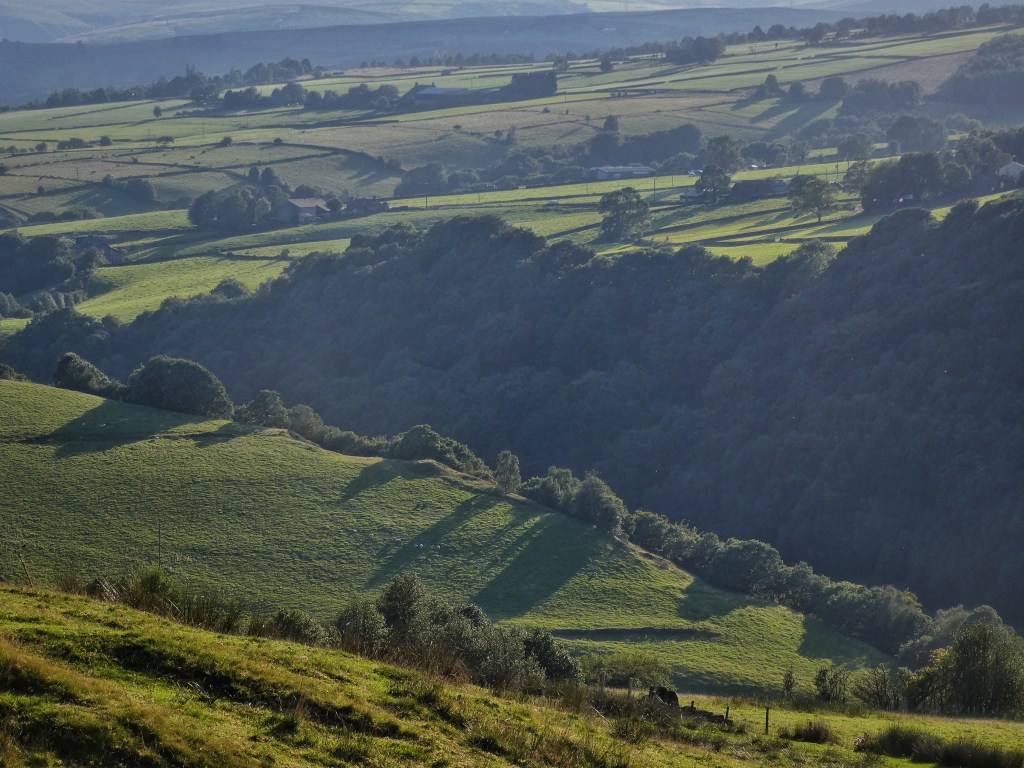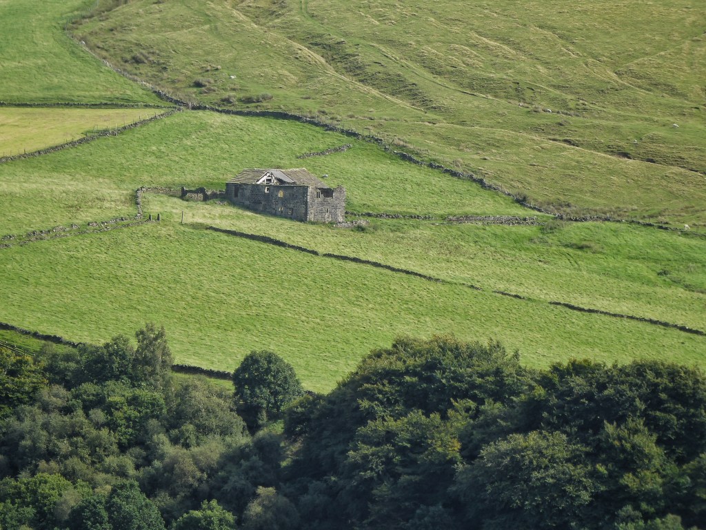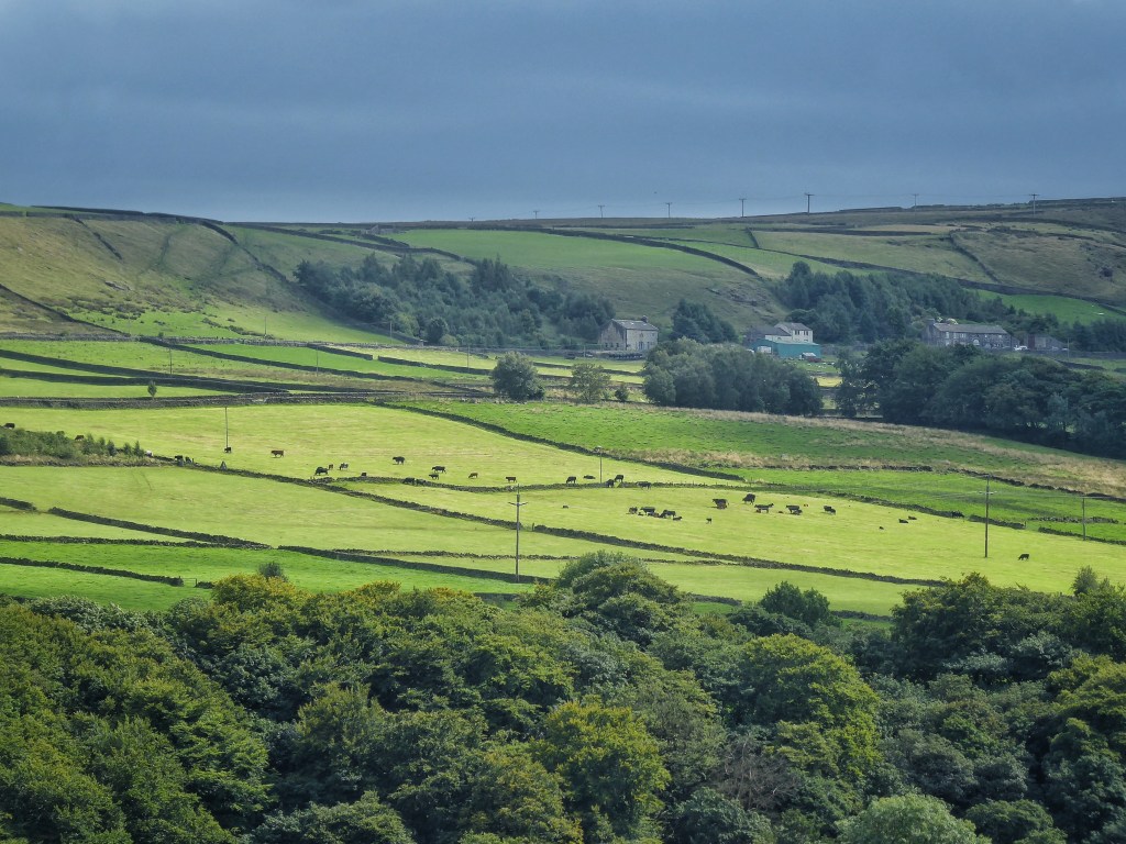 Hazelnuts are ripening along Winter’s Lane. The roots of their trees are next to an unnamed stream which, having gathered in the fields below Pry, flows down through Den Farm, disappears under the Castle Hill quarry, reappears in Knott Wood to flow through the site of Old Charlestown and is channelled under the Woodman railway bridge to the Calder. In times of very heavy rain, its culvert cannot contain it and the main road is flooded, cutting off this trans-Pennine route. Its usual benignity – today, as most days, it gently burbles under the lane – and convoluted, secretive course through the woods and under the hillside leads it to be overlooked as a prime candidate for natural flood management measures.