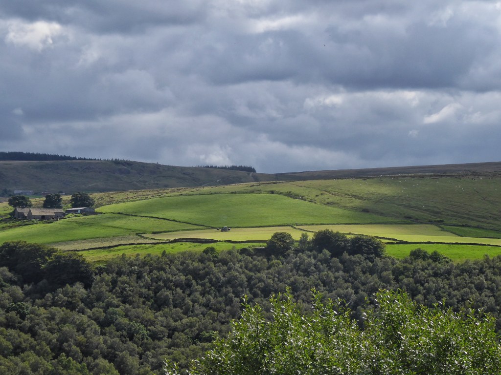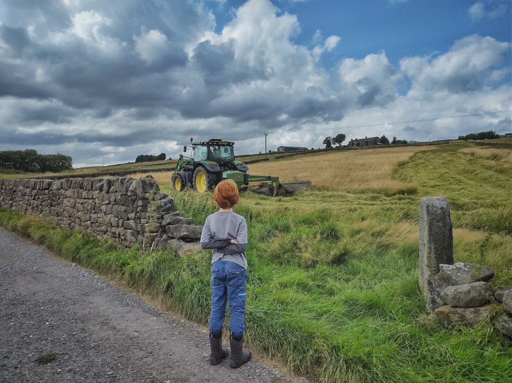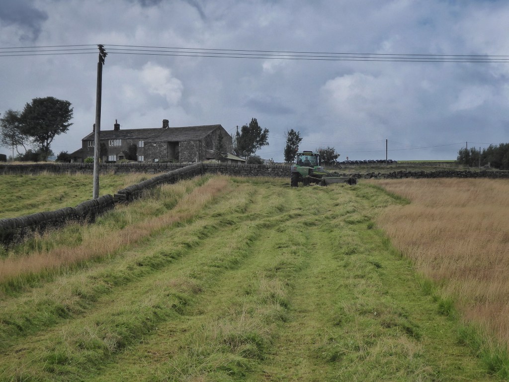 After a clear day of drying, the meadows at Edge End are rowed up, baled, wrapped and gathered to the farm, with another field mown and already drying. At Horsehold, two tractors engage in a well-rehearsed dance with a forage harvester and two trailers, each enormous load carted back to the silage clamp, and the following day the cattle herd are grazing on the pale aftermath. David’s team of four tractors are out in force in the fields around Popples and Marsh, making short work of the tiny fields, carefully squeezing between stone gate stoops that were never envisaged to accommodate a John Deere.
