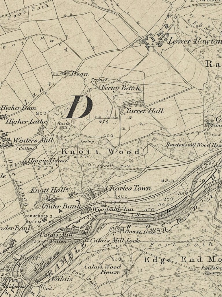 Knott Wood, which climbs the northern side of the valley above Charlestown, is a microcosm of these changes. If English Nature’s seminal 1980s Ancient Woodland Inventory survey is correct, it was once an isolated 20-acre woodland. Moreover, while its appearance on the resulting survey map means there is evidence that it has been continuously woodland since at least 1600 (the definition of ‘ancient’ woodland in the UK), it is not accorded the survey’s premier award of ‘Ancient and Semi-natural Woodland’, but the second-class stature of ‘Ancient Replanted Woodland’, meaning that when the Inventory was being compiled, there was some reason – perhaps the fact that it is not depicted on Jefferies’ 1775 map of Yorkshire, maybe that its magnificent oaks appear to all be of similar age – to believe that it had been cleared and replanted at some point in the last four centuries. From the assumed 17th- or 18th-century minimum size depicted on the AWI, by the time of the 1835 Myers map and the very first edition of the Ordnance Survey in 1851, it has extended a little along its top edge at Ferny Bank, but otherwise its shape and extent remains the same for the next century and more.