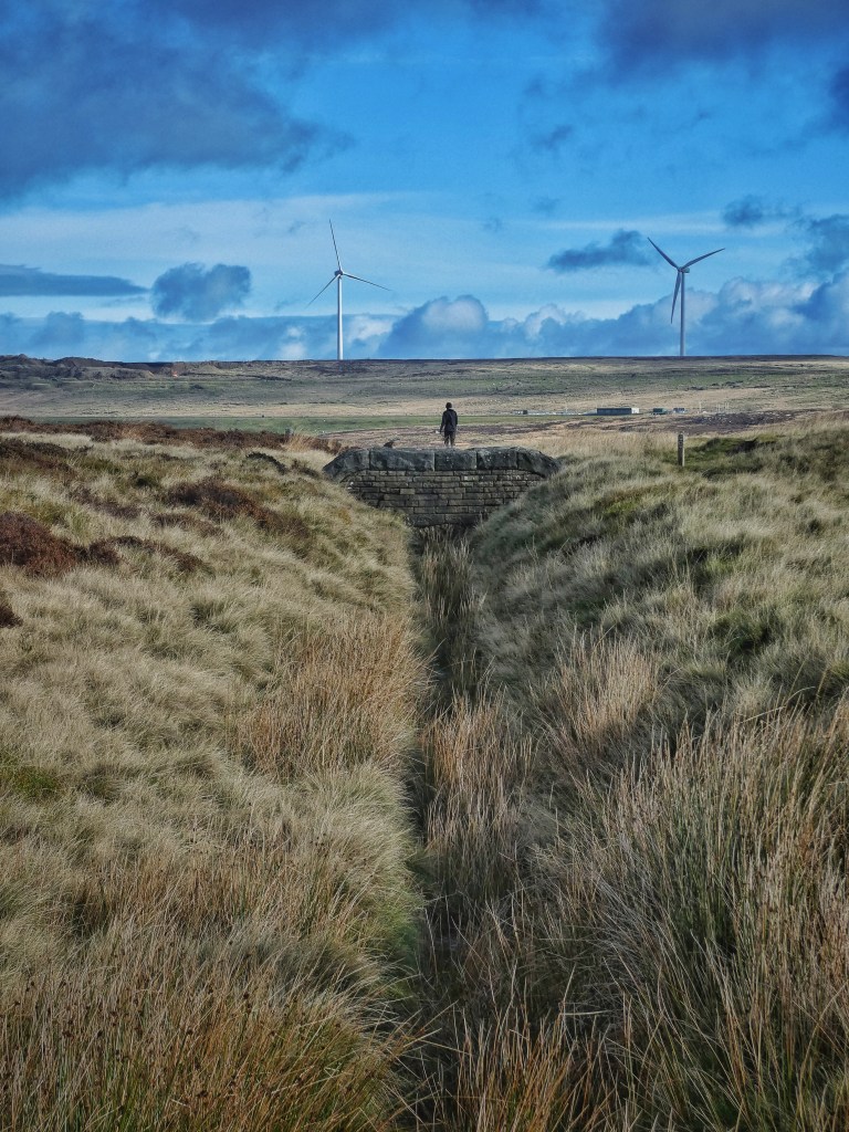 The sound of water that has no business being heard here – having fallen on the moors at Widdop and Gorple and Walshaw, and being a little over half way through its 10-mile journey to Halifax – issues from the grated windows of two ventilation shaft caps, marking the line of John F. Bateman’s Castle Carr Tunnel 500 feet under the grassed-over spoil heaps deposited beside them. On the other side of the watershed, a one-and-three-quarter-mile-long catchwater drain harvests over 400 acres of the moor for Bateman’s earlier Warley Moor (Fly Flatts) Reservoir. Nowhere here is water allowed to run where it may.