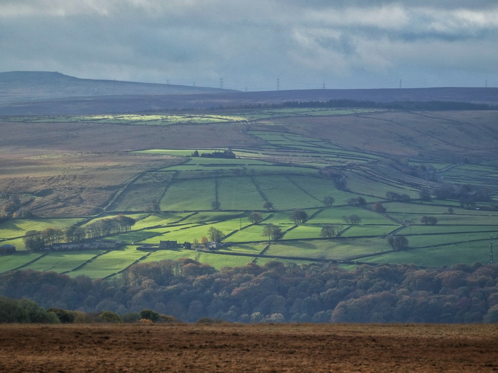 Between Miller’s Grave and the trio of cairns to its south, Bracken’s Folly is a more recent, more idiosyncratic impression left on the moor: an 11-acre enclosure ordered, some time before 1850, by well-meaning but misguided owner of Dean Mill, Jonathan Bracken, to provide crops and local employment. At 1200 feet, it is not quite the highest enclosure in the district, but it is terribly exposed on the flanks of Crow Hill, and its isolation on the moor without its own farm is unique. While its grass evidently retains enough sweetness for the sheep to prefer it to the surrounding tougher vegetation, its broken walls and the low heap of stone and brick remains of a shelter in the centre, confirm its name as well-earned.