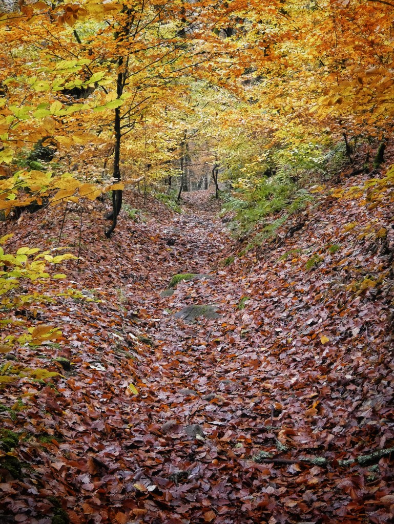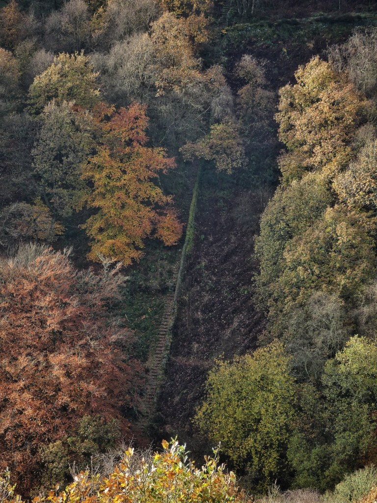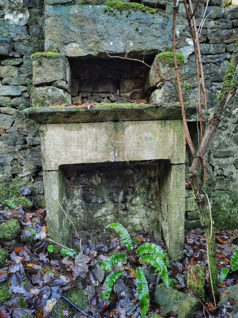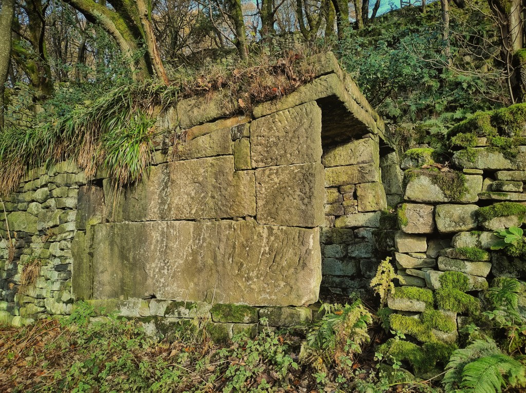 Part of both the Stead and Rawdon family’s success came from their mills in Jumble Hole Clough, a defile cut into the valley side, less than a mile in length but a world of its own. A grey wagtail lands on the roof of Jumble Hole Mill, formerly the Underbank Dye Works and now converted to dwellings, just as the sun strikes it; and what remains of Spa Mill is being held together by ivy seemingly so that it can get a better grip and more effectively tear it stone from stone. Above the latter’s massive dam wall, the glossy green flames of Hart’s-tongue fern burn in the hearth of the dam-keeper’s hut, known as Queen’s Seat.