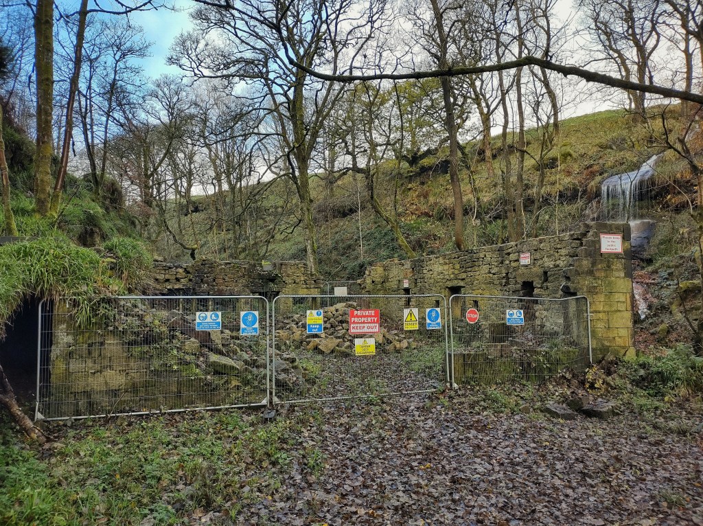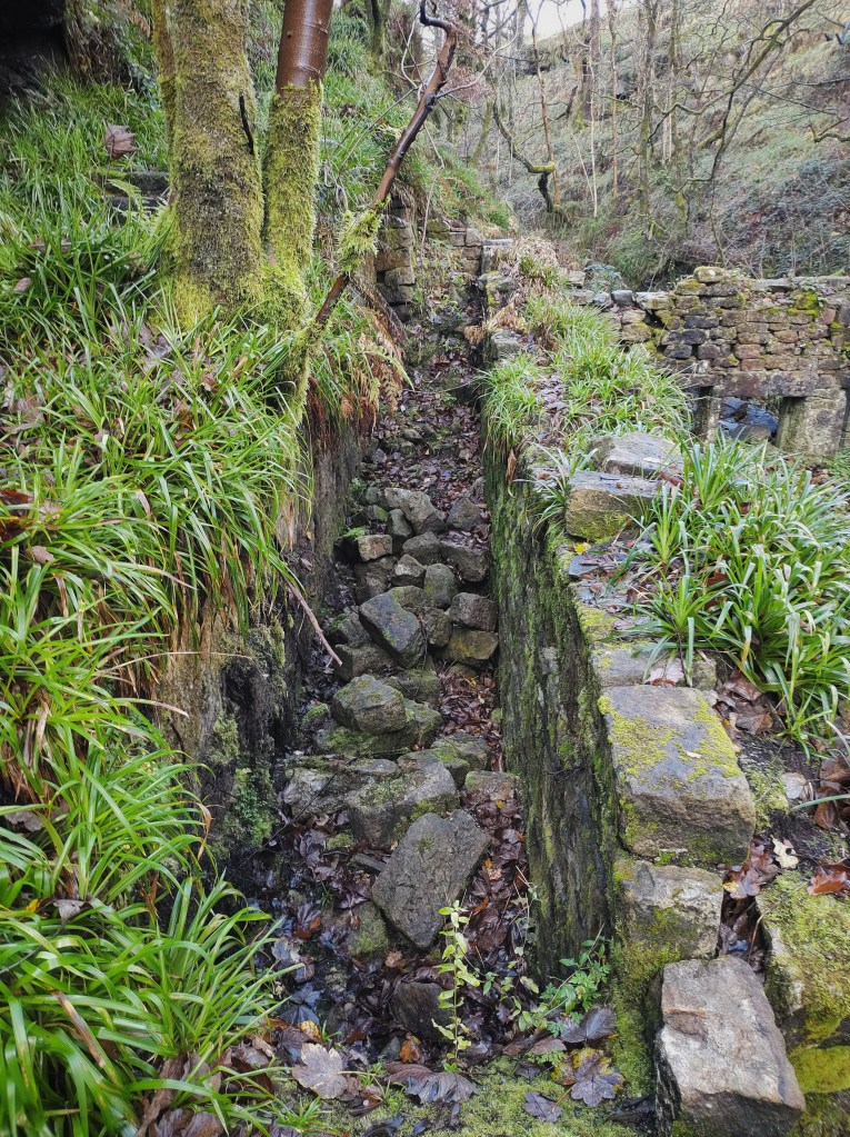 Further up the clough were two more mills: Cowbridge Mill, where the stream spills spectacularly over a weir and the back walls and terraces of the workers’ cottages can still be seen; and Staups Mill, until recently among the most celebrated of the romantic ruins the area had to offer, but now much reduced by new owners. The removal of its stone has revealed the wheel pit and a preserved piece of wheel or possibly sluice gate, perhaps the first time it has seen the light of day since a part of its dam wall collapsed in September 1896.