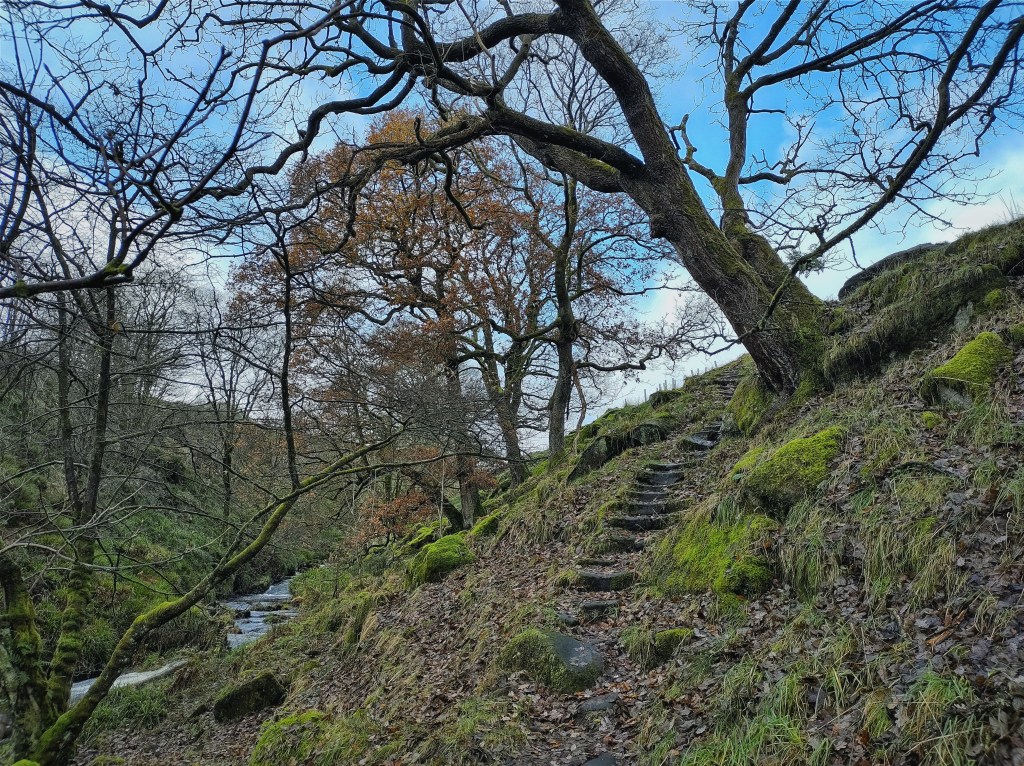The woods of the clough – Tommy, Dean, Bevereley, Cow Bridge, Naze and Spring – that were diminished and fragmented in the 19th century, have expanded and joined today, almost entirely filling the little valley. The clough stream, which must have always largely remained wild between Cowbridge and Staups mills, is more so than ever now, not least on August 25th 2012, when a cloudburst on the moors above funnelled an unprecedented force of water down, scouring the streambed and every stone and boulder so clean of lichen and moss that for several months afterwards it was possible for a walker to comfortably and safely rock-hop in the stream all the way to Hippins Bridge, an impossibly slippery expedition before and since.