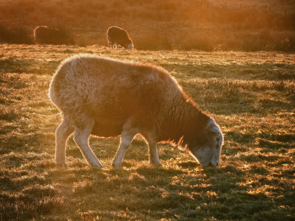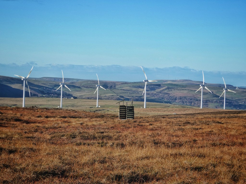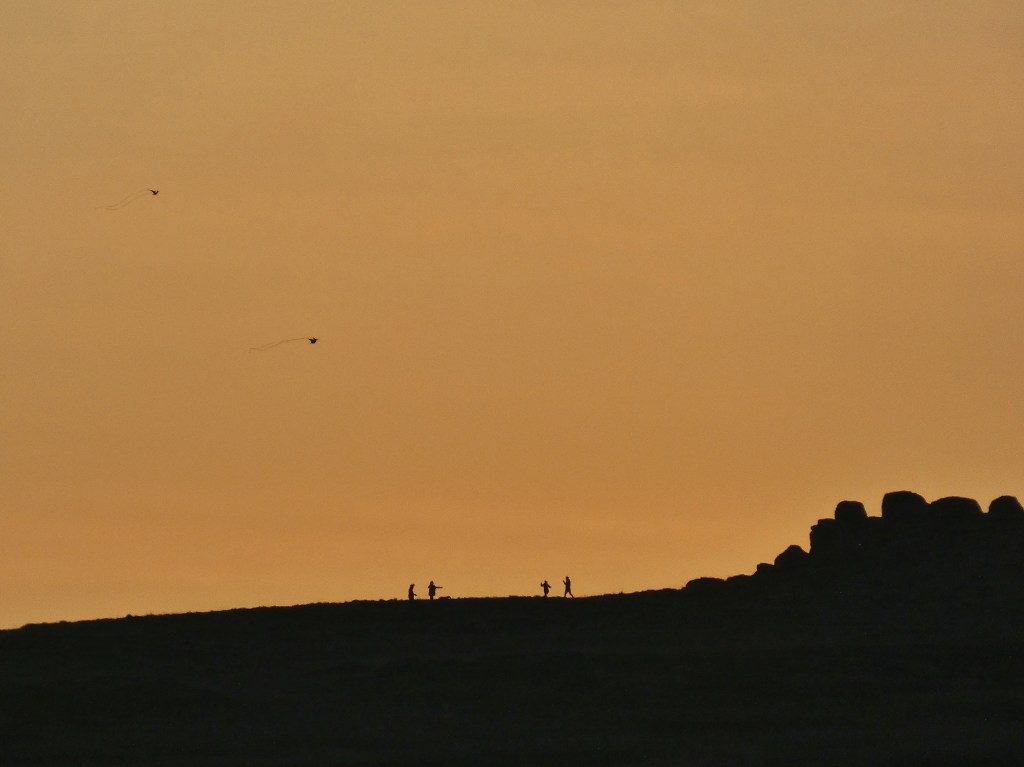 As the sun rests on the skyline, a barn owl climbs the half mile from Noah Dale to the head of Cross Clough, hovering then stooping into the grasses, rising and dipping among the tussocks, sewing the intense last light caught in its translucent porcelain wings into the shadows already staining the sombre moor. At the clough’s head, the day’s final glow is absorbed by the stones of Earnshaw Hole and burnishes the wool of a flock of Herdwicks at Four Gates End as they gather before the farmer on his quad and the controlled pace of his collie. Echoing into the placid quiet of evening are the reports of gunshots on the moor and of mallet striking stake as the farmers at Moorhall hurry to finish a stretch of fencing before the light fails. Beacons wink on: the almost-full Moon reveals itself as the blue drains from the sky, as does the gleaming white of Jupiter and, describing a stately slow arc under both, the International Space Station; the flashing orange of gritters threading their way across the hills warn of the cold this clear sky will subject the night to; and the steady red of Emley Moor is on its own again since its companion for these past five years was dismantled in September. The cobalt blue of night is drawn from the east and presses down on the last peach glow, on which is etched the weathered charcoal stumps of the Bride Stones, and the sharp silhouettes of a family flying kites in the bitter evening wind.