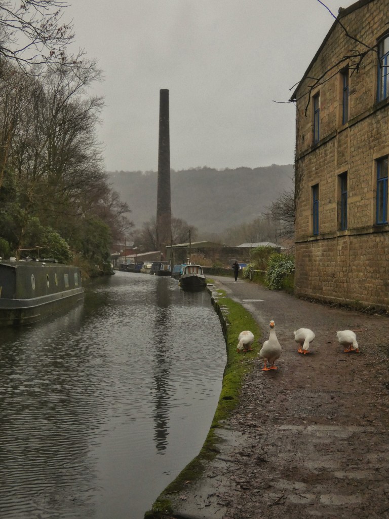 After a weekend-long deluge threatened to briefly reclaim those meadows once again, the river levels have returned to normal. The low soft sun glances over the beech trees of Crow Nest Wood, lighting the last green-gold leaves hanging on the end of the pendulous birch branches beside the half-a-milennium-old packhorse bridge. Goldfinch prise at the cones of the alder that lean out over the water behind the Shoulder of Mutton, paving the way for a party of long-tailed tits, who swing and pivot their way like gibbons through the twigs. Always moving, they leap across the bridge to the weeping willow that rests an elbow on the parapet, and then cross Old Gate to the bank of sycamore where the rabbit-warren slum terrace of Buttress Brink stood until demolished in the 1960s. Pigeons coo above the Wavy Steps, the single place which allows access to the river on its passage through the town, then descend when a couple arrive to feed them and the ever-present ducks. The peace of the scene makes it difficult to conjure the turmoil of a flood, or the riot of humanity that must have passed through here when the shifts changed at the mills for which this town was built.