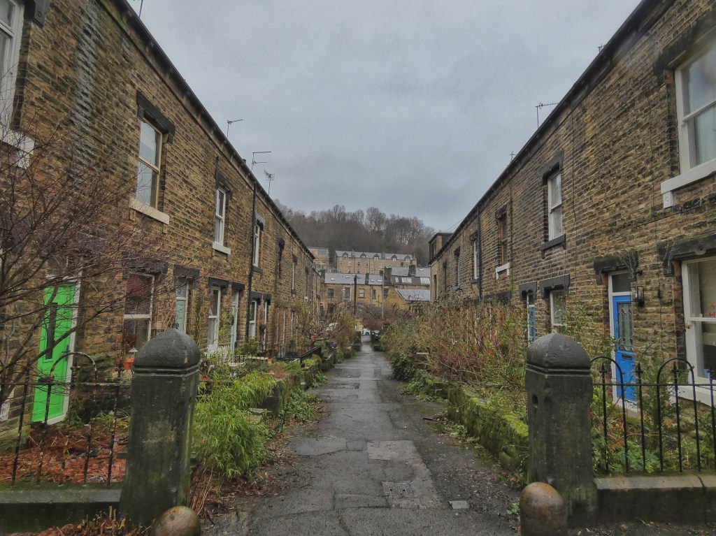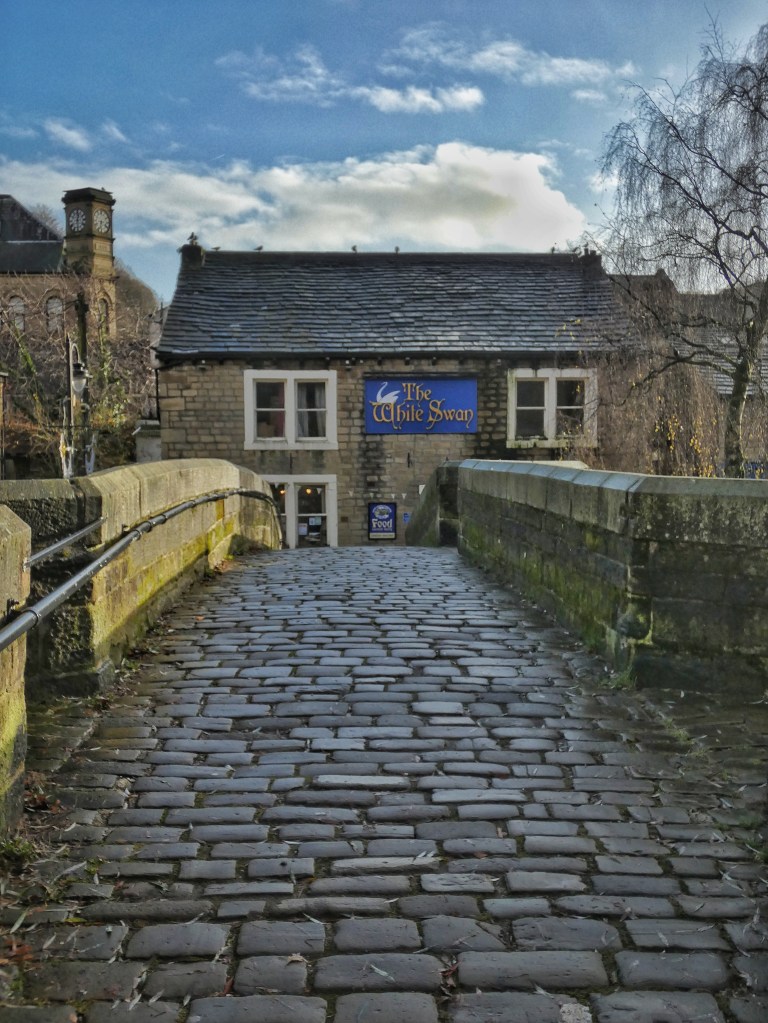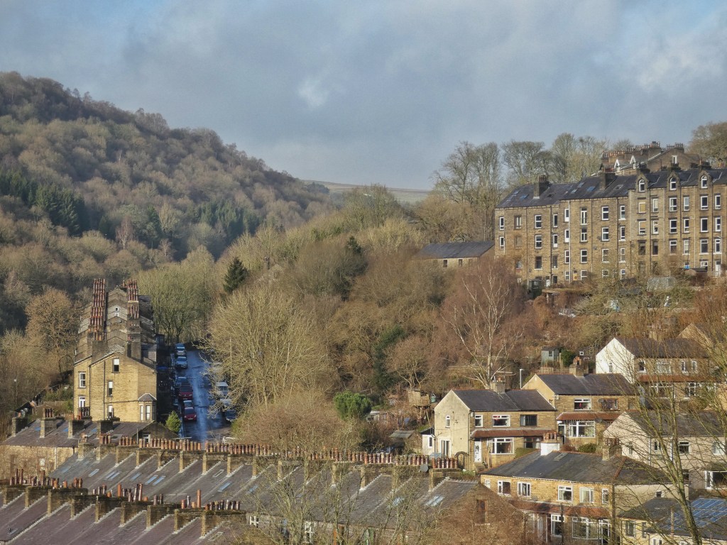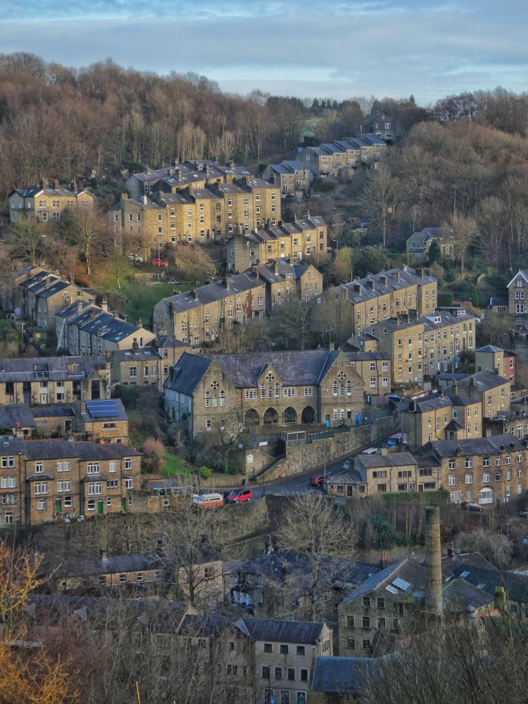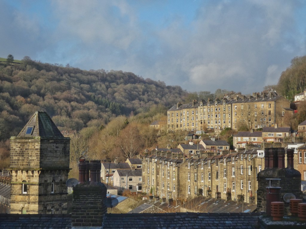 That kernel had been developing slowly for long quiet centuries. First a 14th-century corn mill; then a 16th-century stone bridge to replace the earlier wooden crossing of the Hebden Water for the Halifax–Burnley packhorse route which still plummets down Stoney Lane (also known as Bankside) and then labours up The Buttress to Heptonstall; then Kings Farm in 1657, which took advantage of the passing trade on the first turnpike road and converted to the White Lion Inn in the mid-1700s. Another pub, the White Horse, soon followed, built on the site of Bannister’s Farm. But even eight decades after the first Birchcliffe Chapel was built in 1764, the named fields that would soon be developed – Croft, Gem Lands, Brigg Field, Lower and Higher Stubbing – were still open. The Rochdale Canal was opened in 1798, and then following the coming of the Leeds–Manchester Railway in 1841, it took barely 50 years for the town to largely take the shape it still has today, for its terraces of famous over-and-under dwellings to stagger up the steep hillsides, leaving only a few significant gaps remaining to be filled in by 20th-century housing at Fairfield, Moss Lane and Highfield Crescent. The original single crossing of the Hebden Water came to be joined by five others, at Foster Mill Bridge, Victoria Road, St George’s Bridge, West End Bridge and a footbridge; and the Calder came to be crossed in five places itself, at Victoria Bridge, the canal aqueduct, the Fountain Street footbridge, Hebble End and Stubbing Holme.